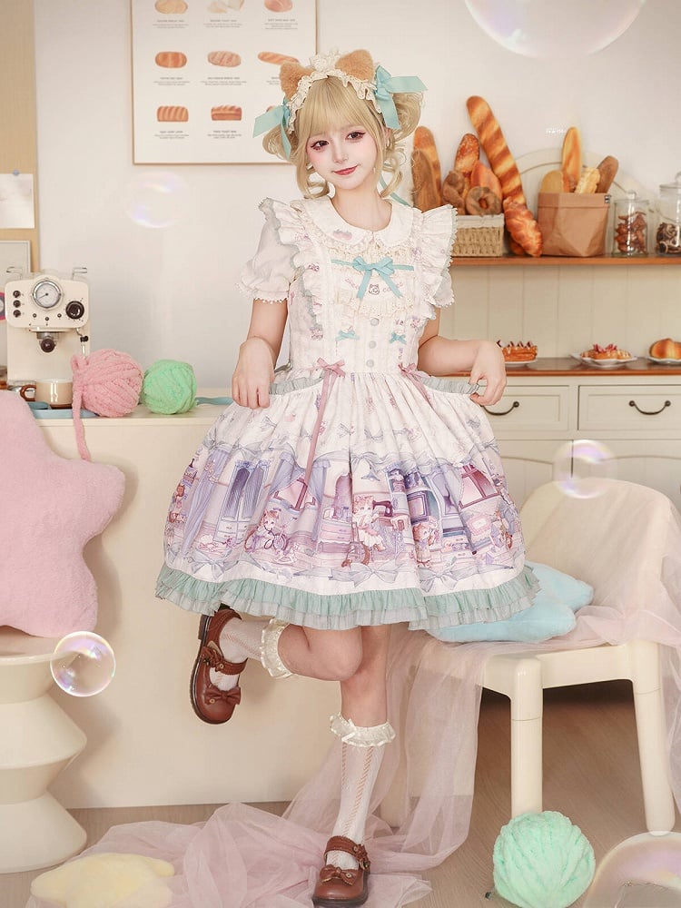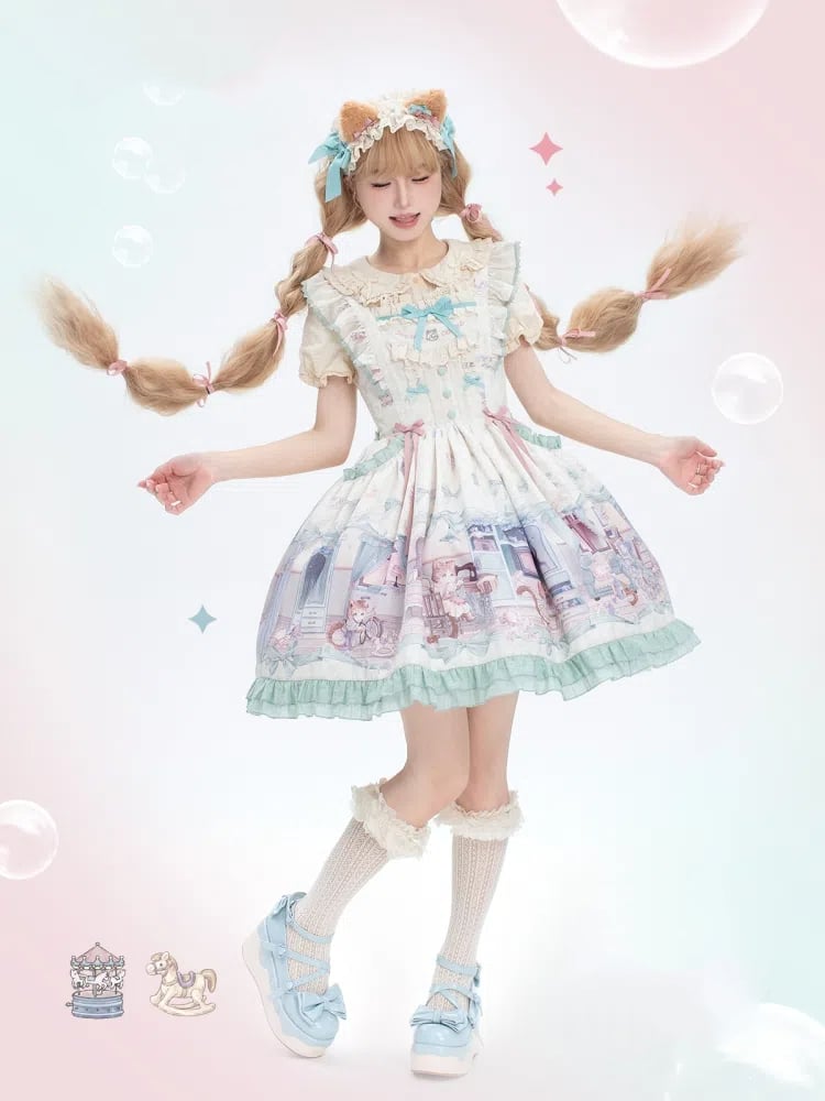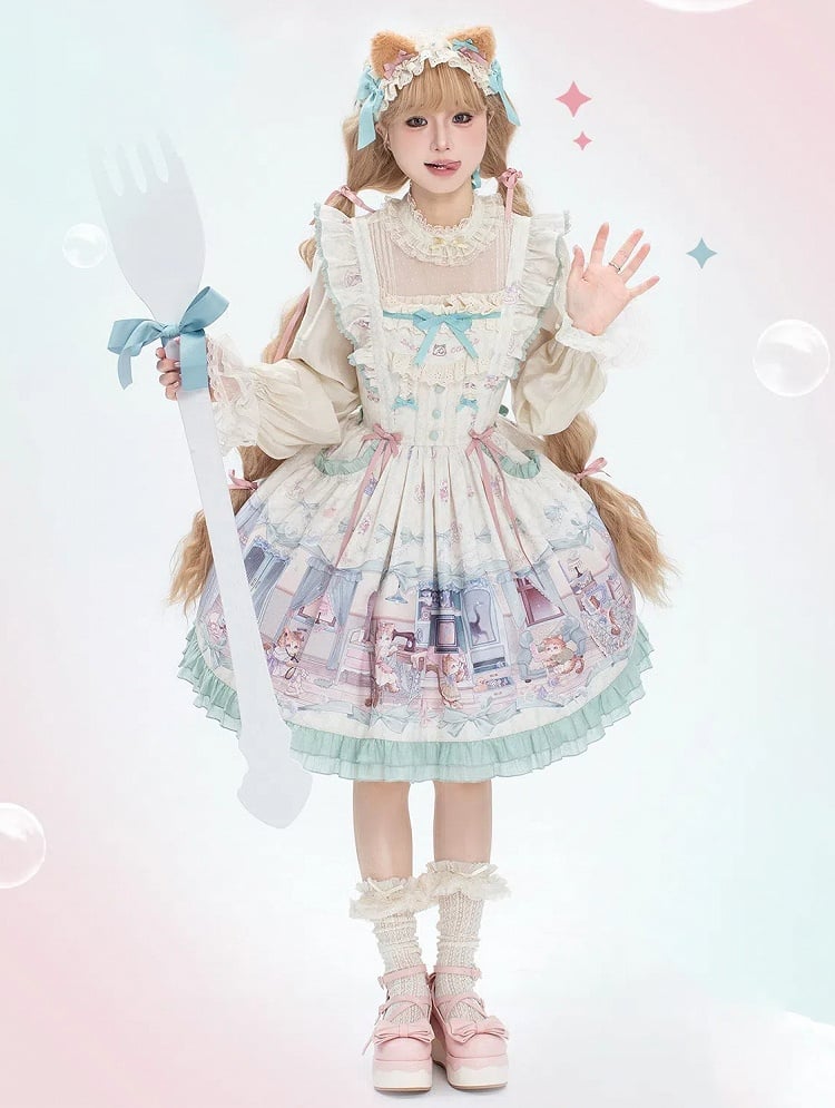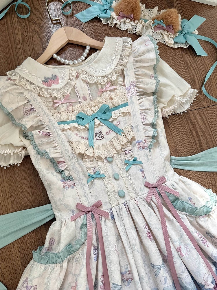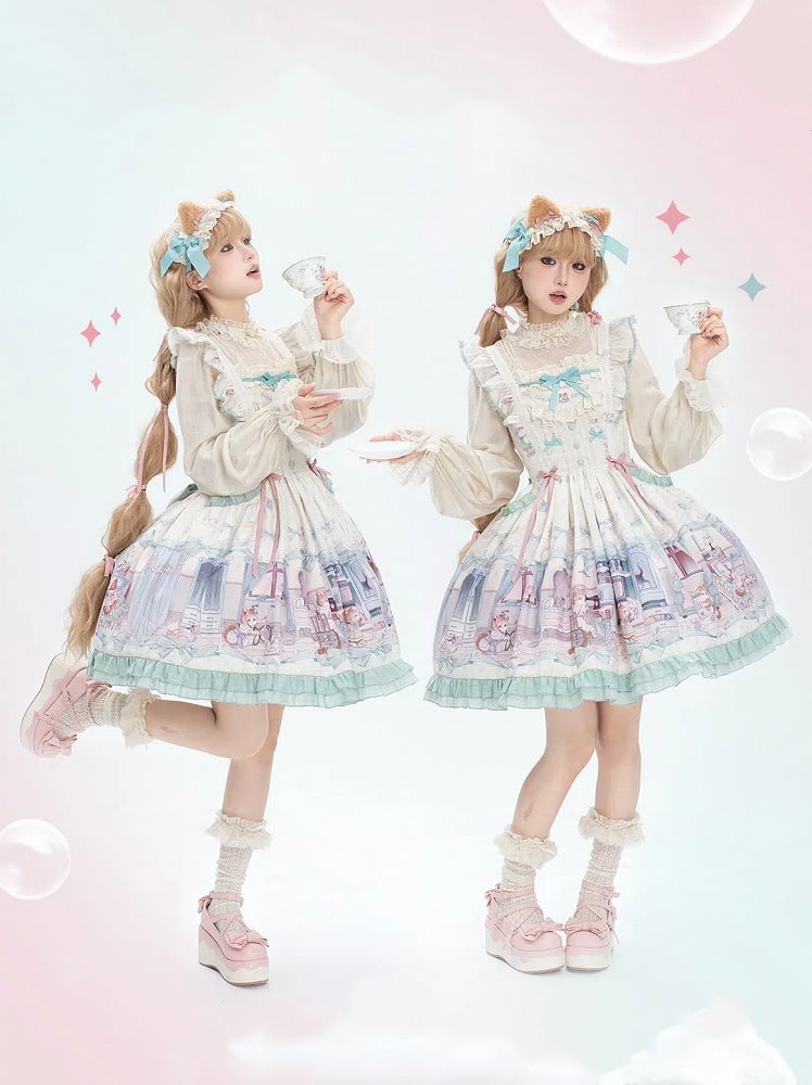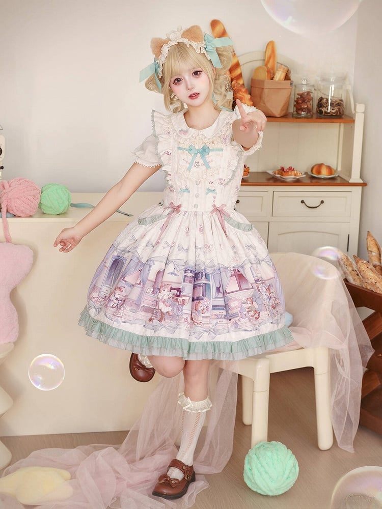 ふわふわのショルダーストラップとジャンパースカートが特徴の、愛らしいスイートロリータドレス。キュートな猫とグリーンのリボンがアクセントになっています。どんなコーディネートにも甘さをプラスしてくれます!