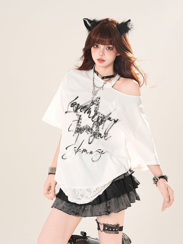 カットアウトショルダー、ダメージ加工ホールヘム、グラフィックTシャツ、ブラック/ホワイト