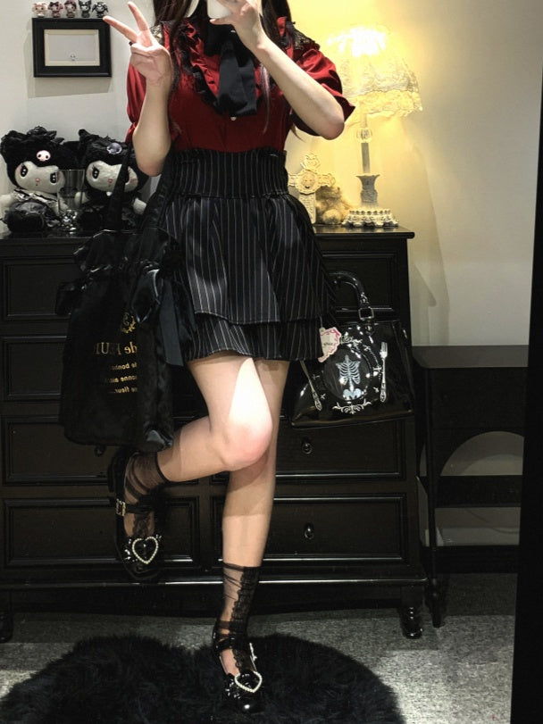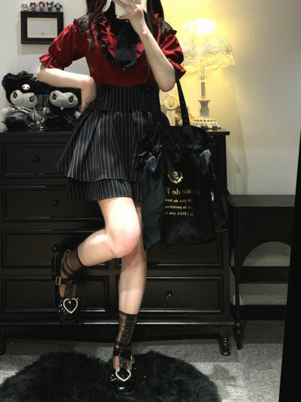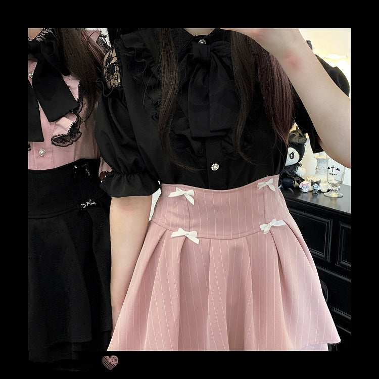ジライケイ ブラック/レッド/ピンク/ホワイト カットアウトショルダー レーストリム ブラウス 蝶ネクタイ付き