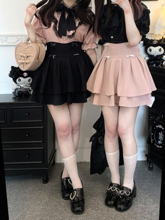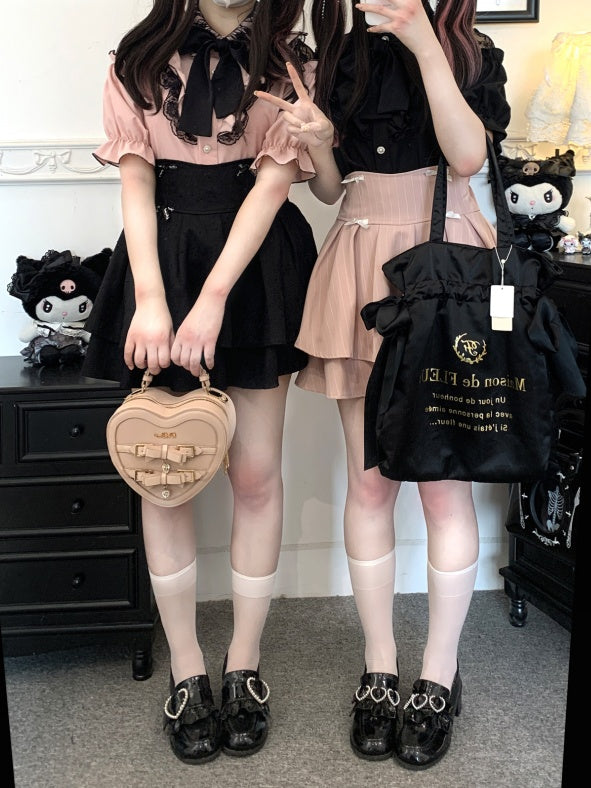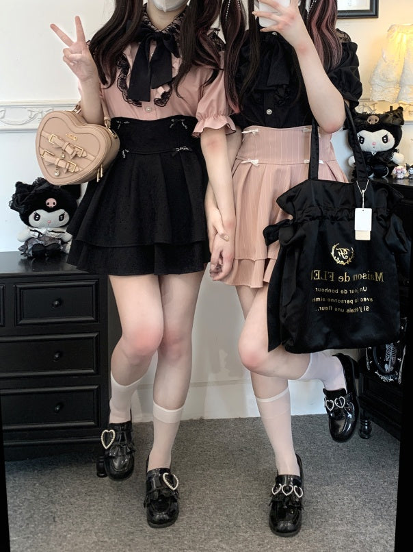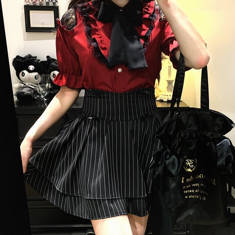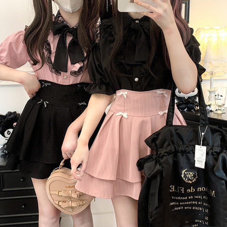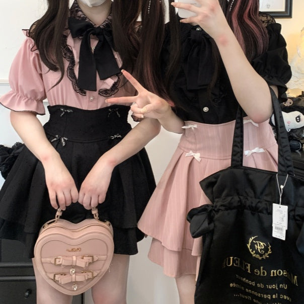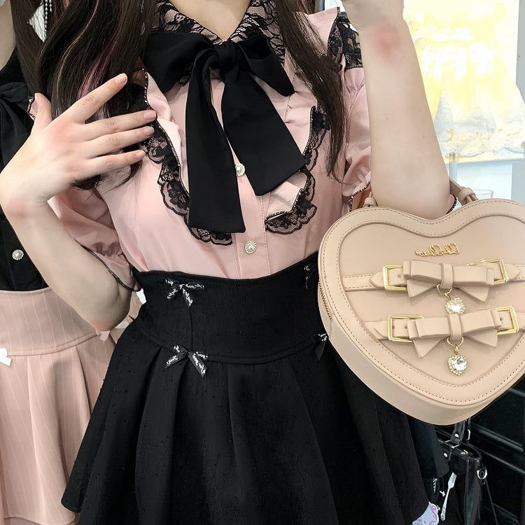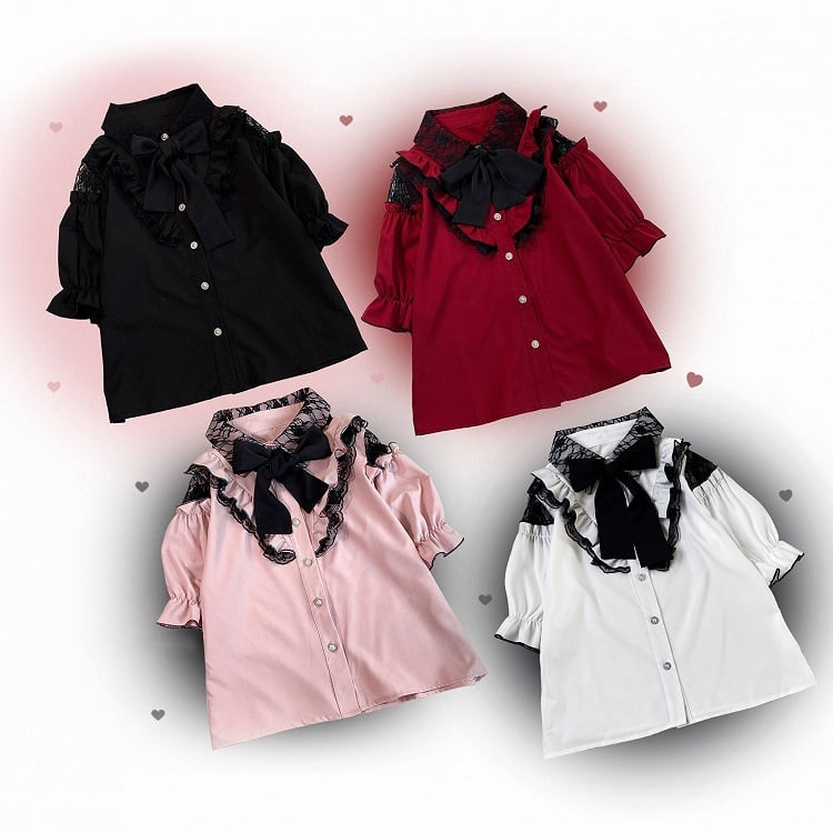 カットアウトショルダーレーストリムブラウスタイ(リボン付き) ジライケイ ブラック/レッド/ピンク/ホワイト