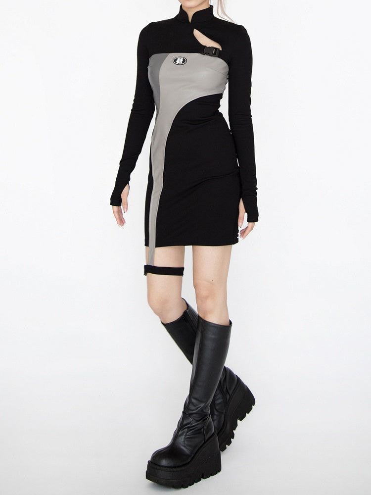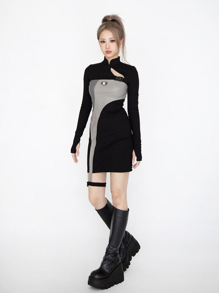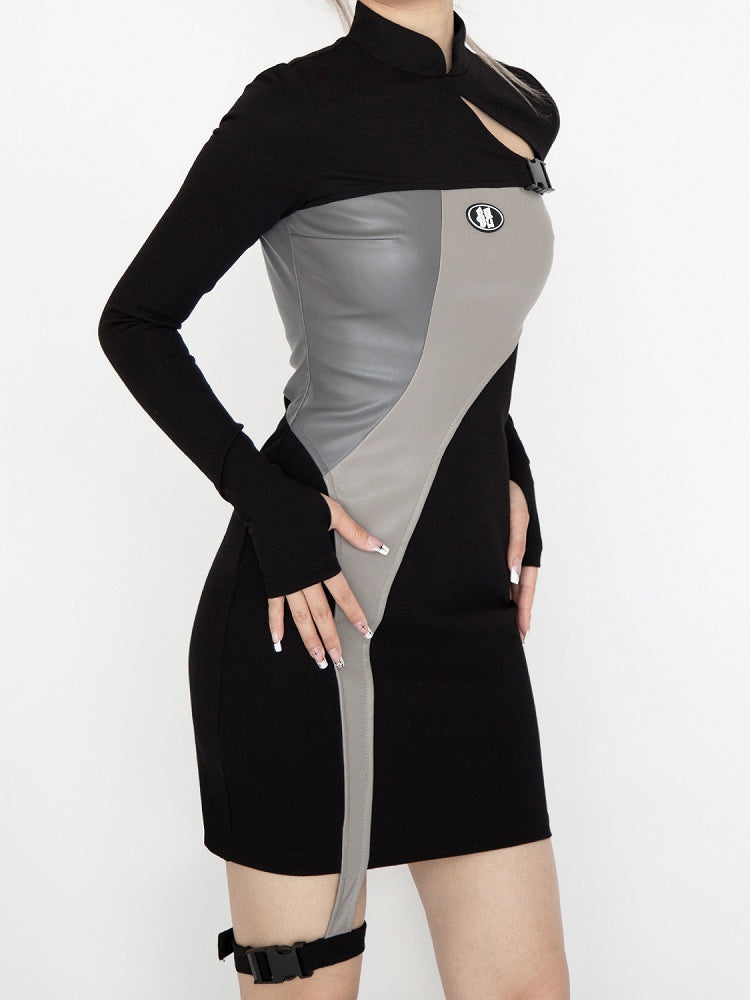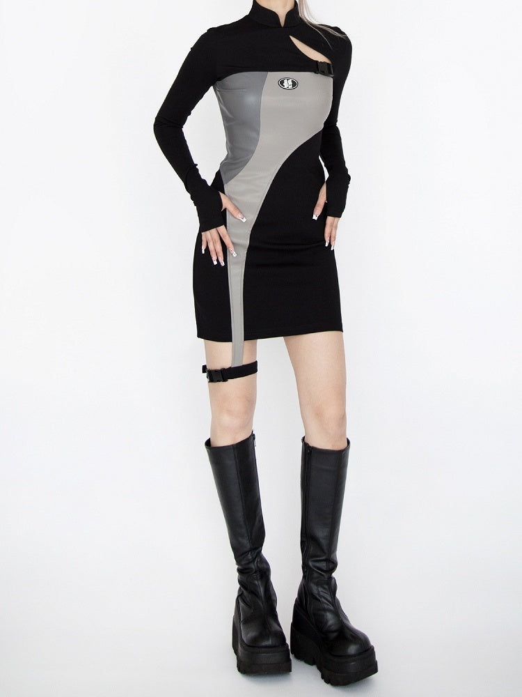 サイバーパンク風の未来的なブラック&グレーのバンドカラーカットアウトディテールのガーター付きグラマラスドレス