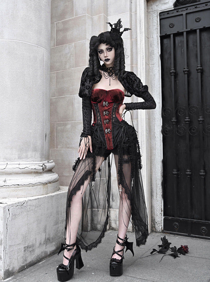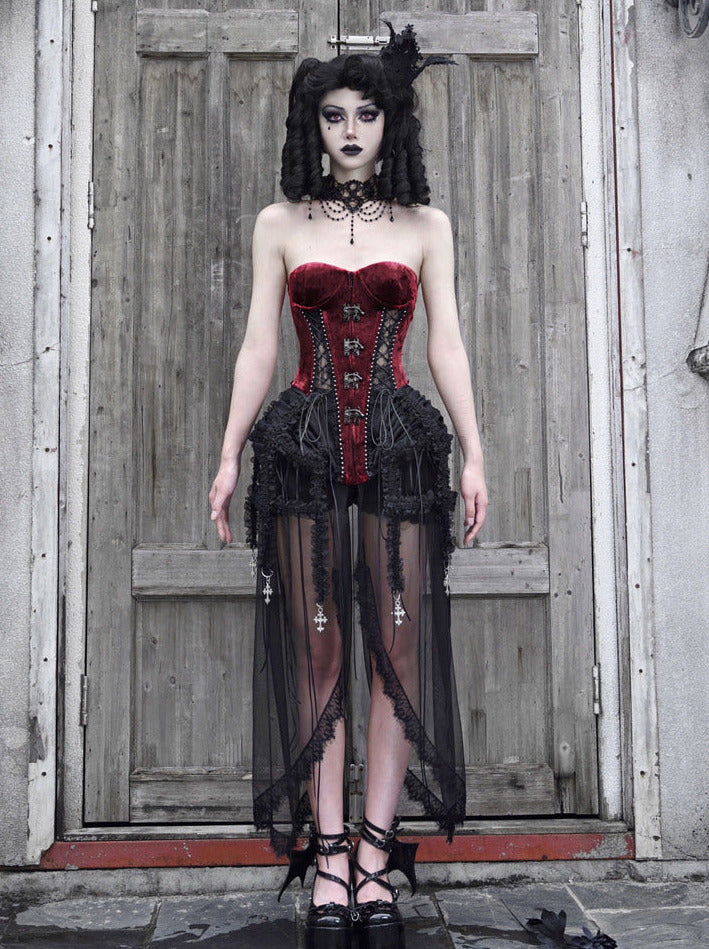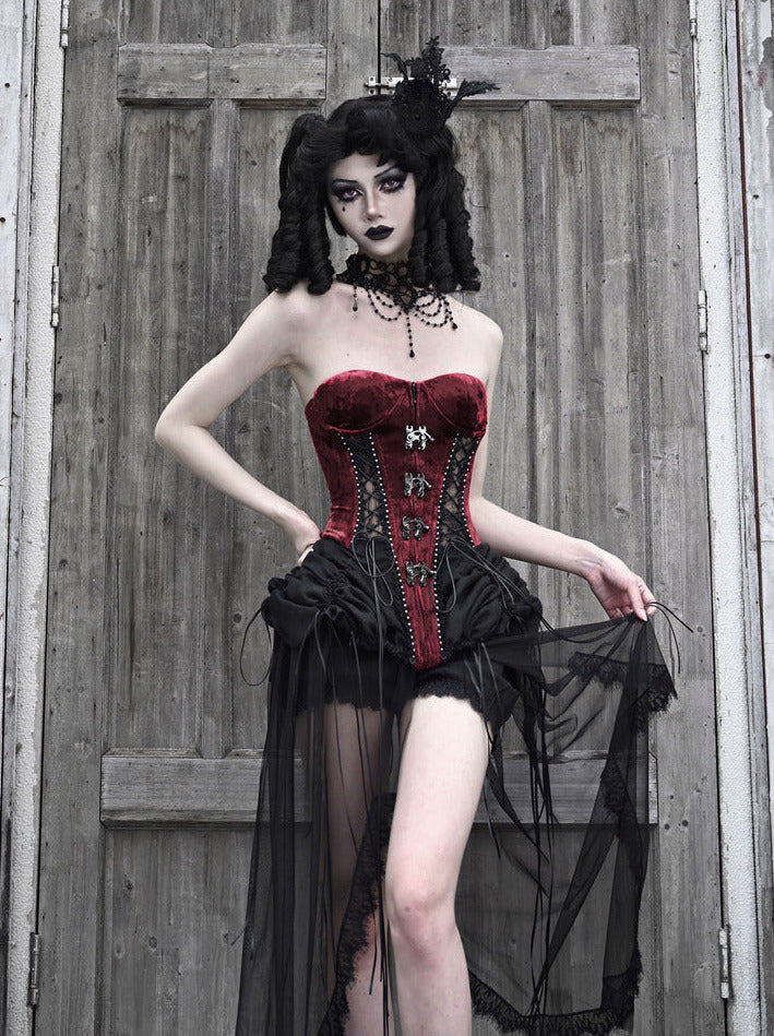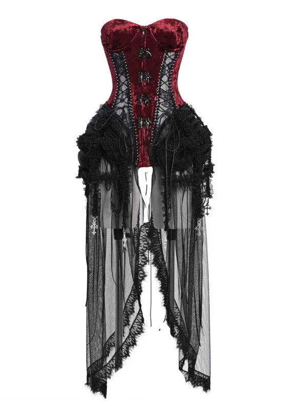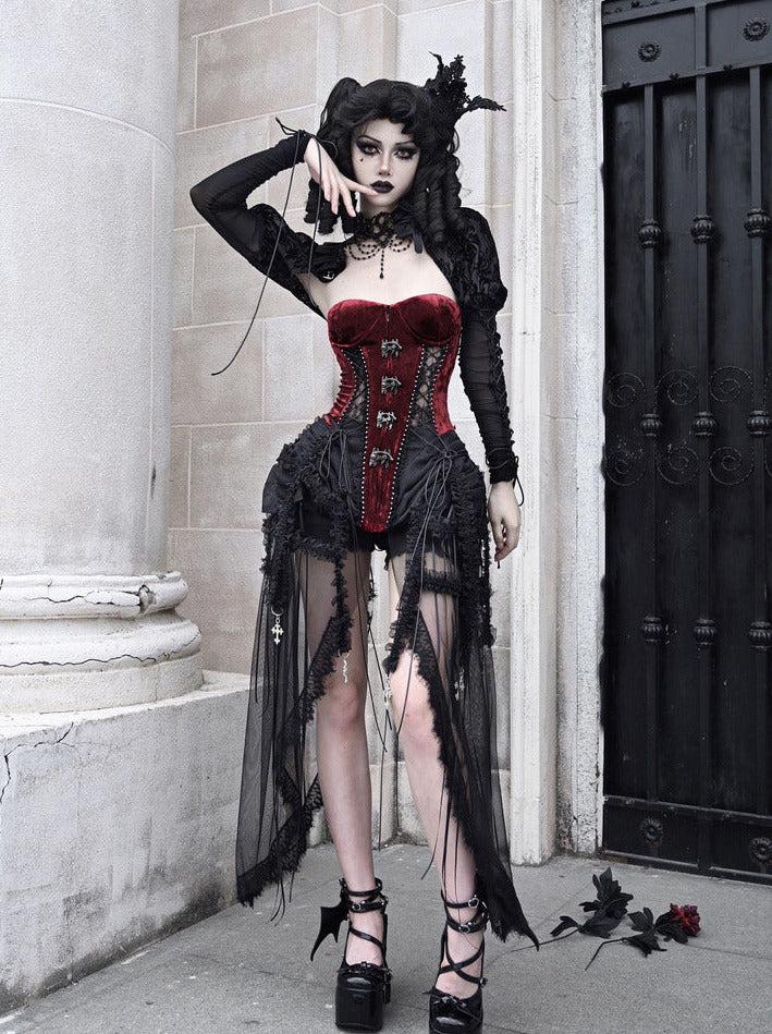 ゴシック風のコルセットセットは、フィッシュボーンストラップとチュールのアクセントが美しいダークアリスデザインが特徴です。キュートでエッジの効いたこのアンサンブルで、スタイルをワンランクアップさせましょう。