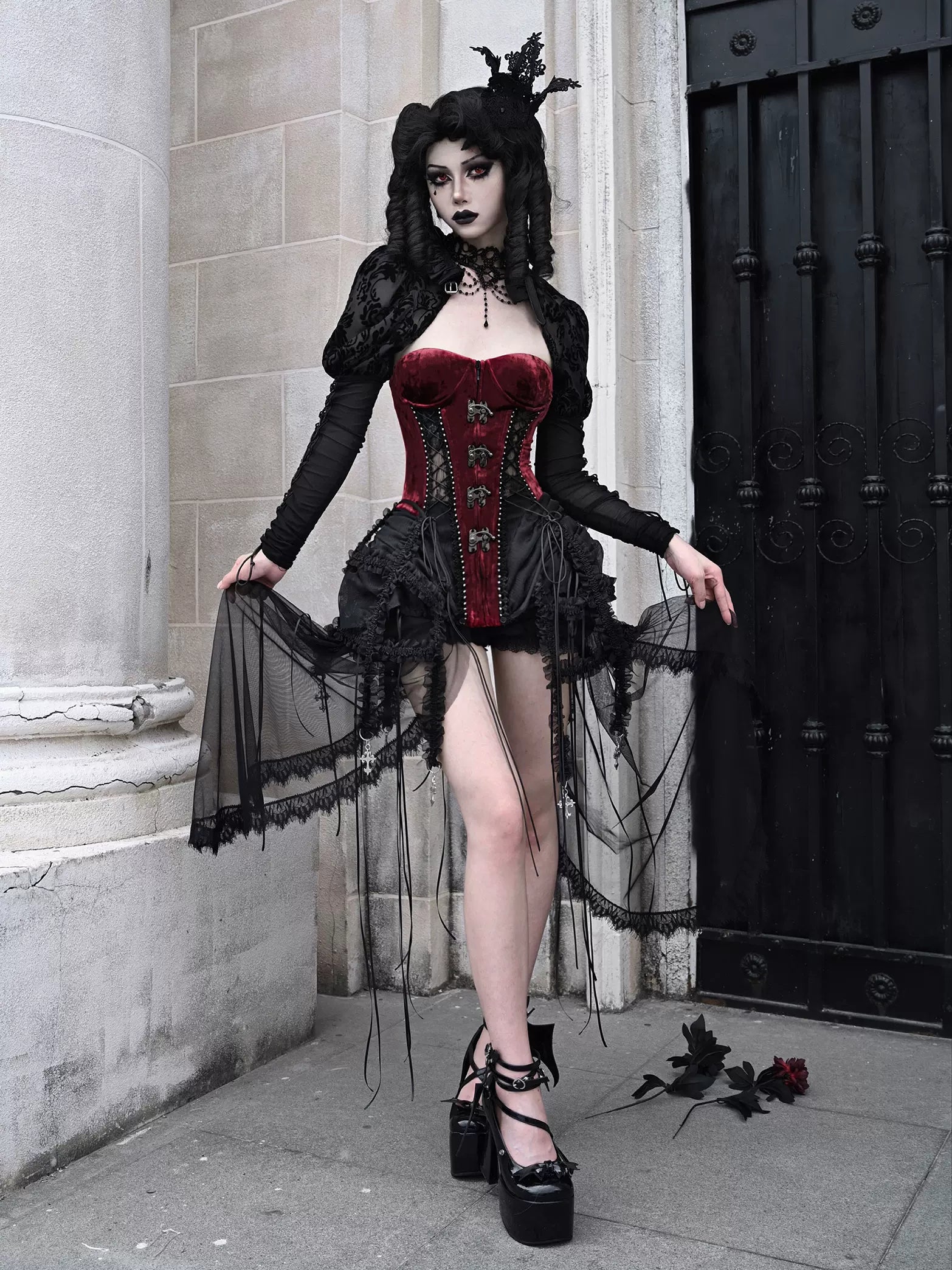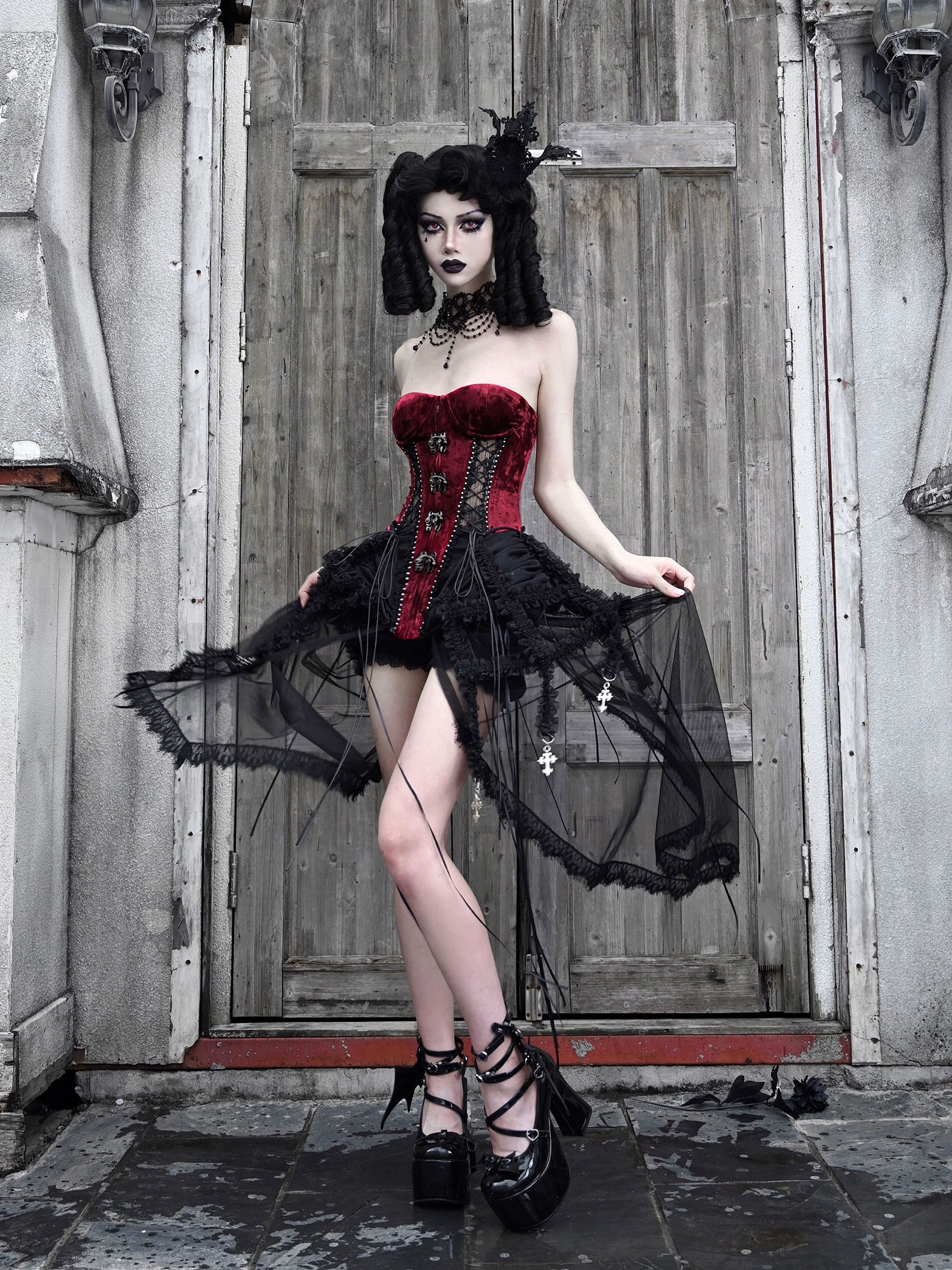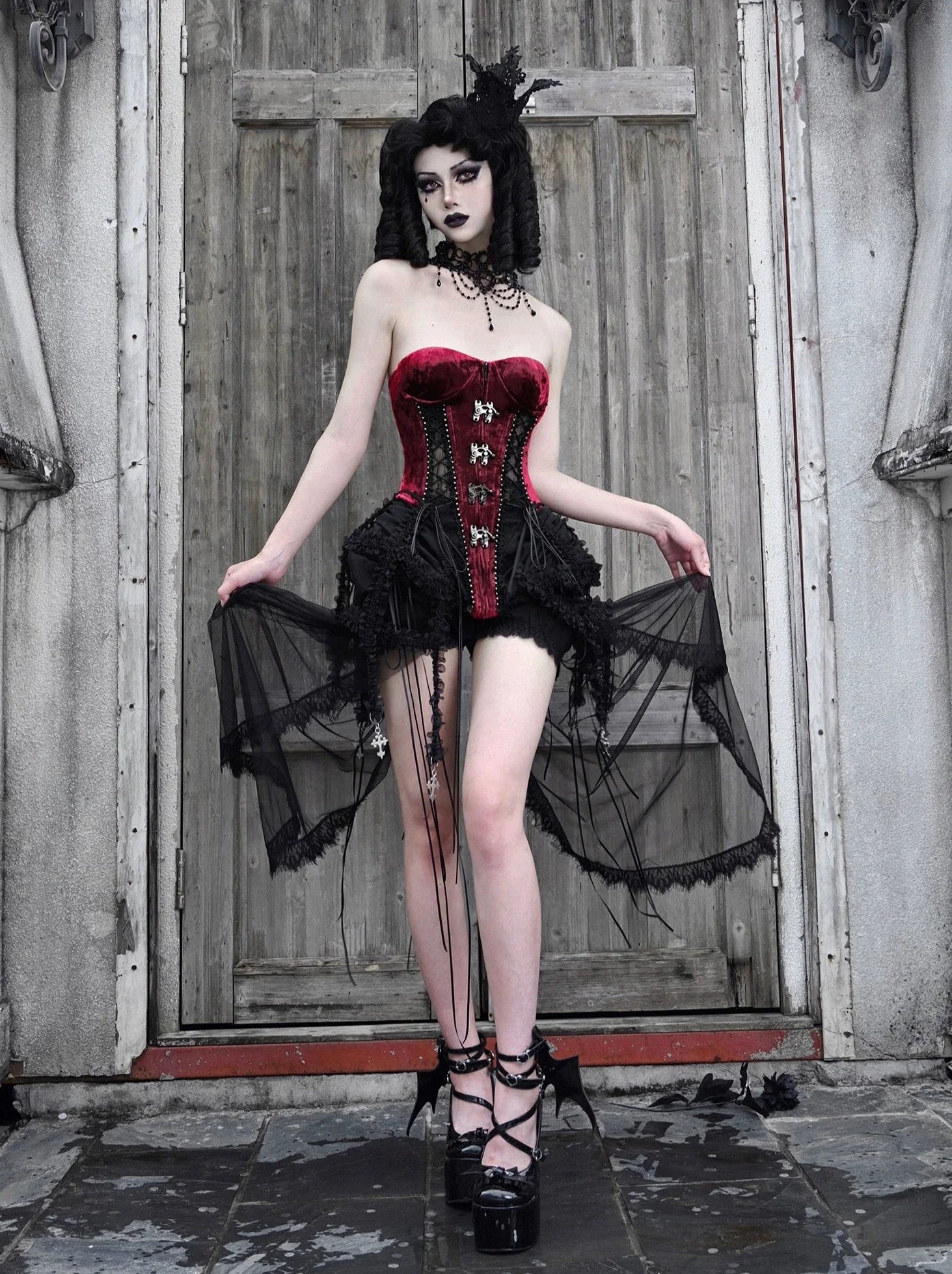 ゴシック風のコルセットセットは、フィッシュボーンストラップとチュールのアクセントが美しいダークアリスデザインが特徴です。キュートでエッジの効いたこのアンサンブルで、スタイルをワンランクアップさせましょう。