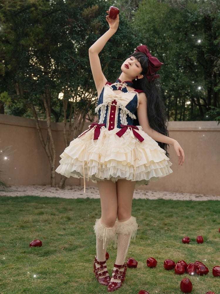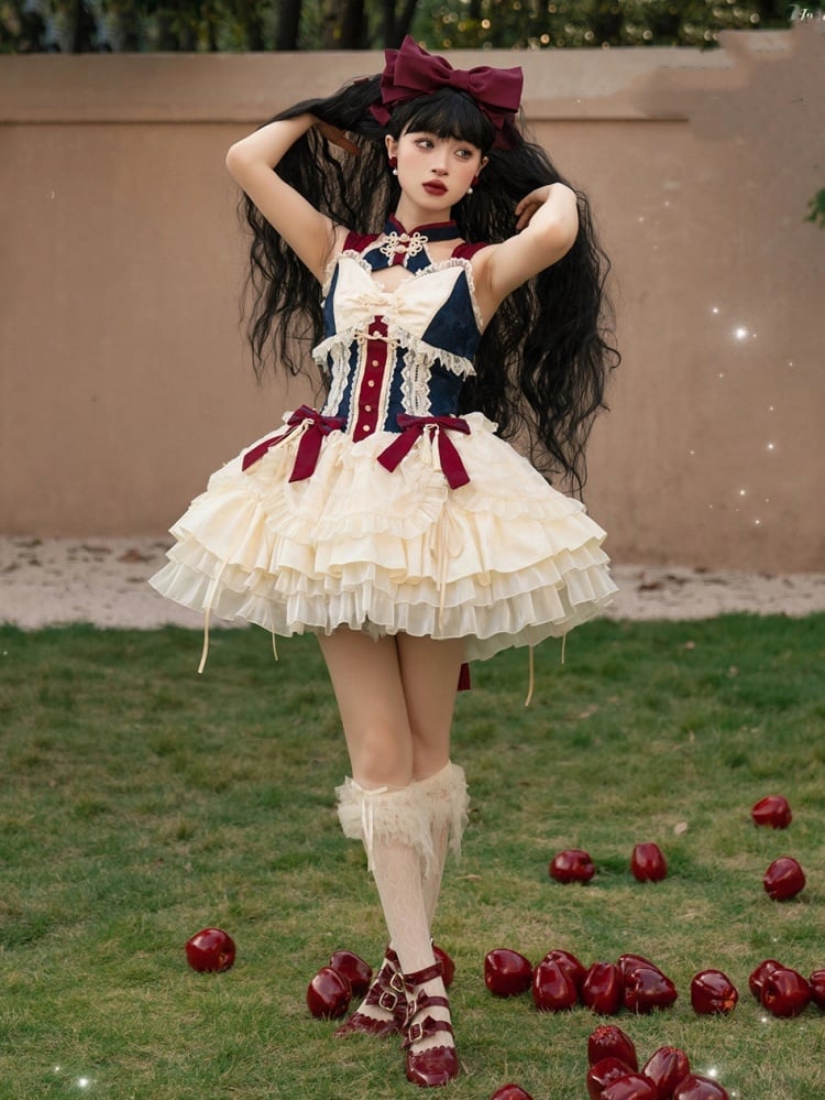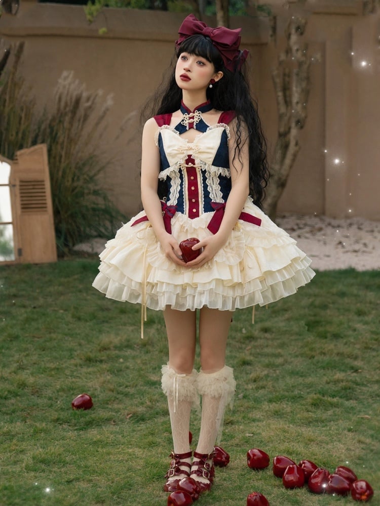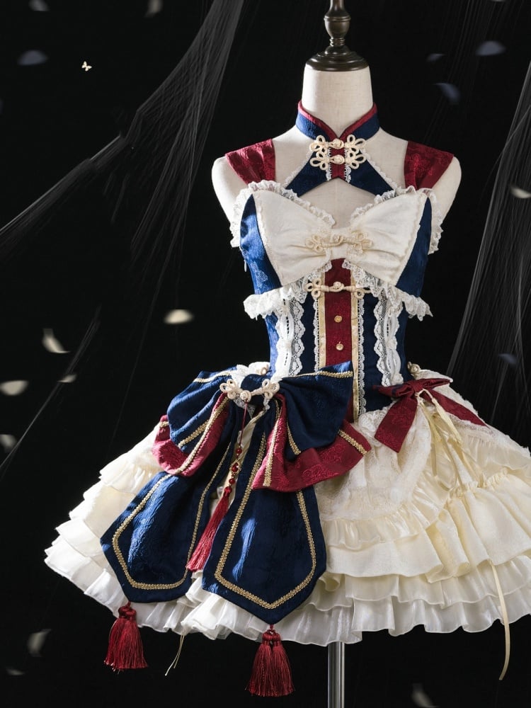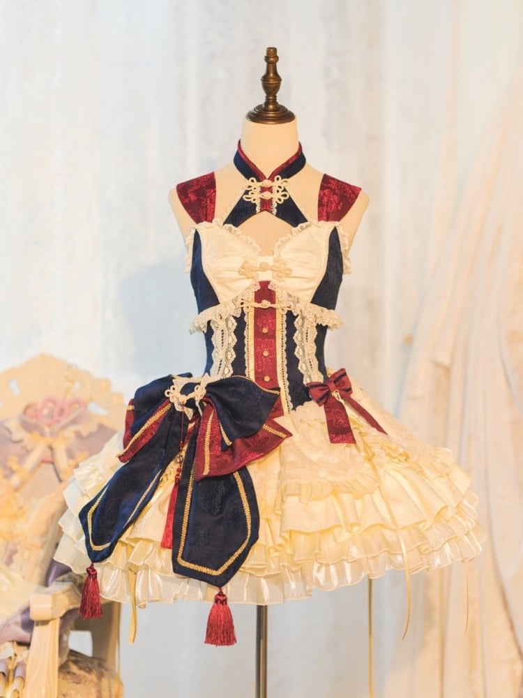 ダークブルーとレッドのジャンパースカートで、あなたのキュートさを解き放ちましょう!取り外し可能な襟は様々なスタイリングに活躍し、ティアードフリルがエレガントな雰囲気を添えます。このスタイリッシュな一着で、心地よく動き回りながら、気のエネルギーを体感してください。