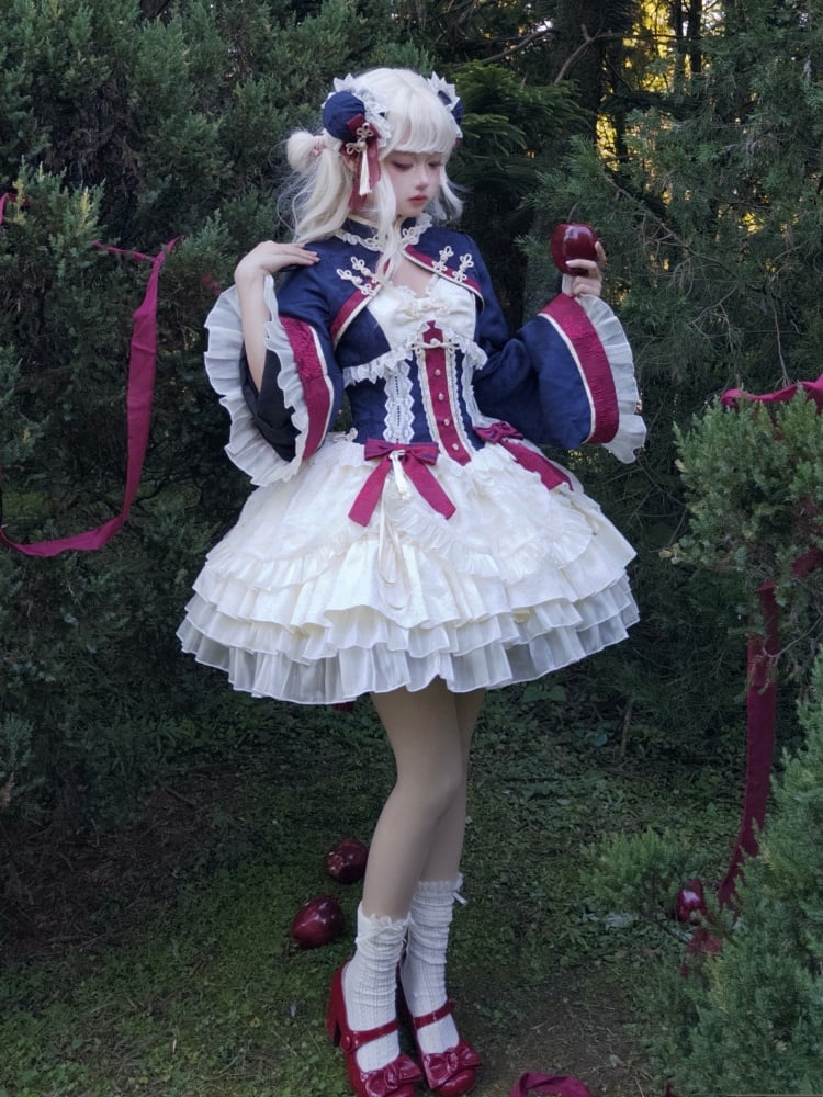 青と白のオールドスクールロリータファッションドレス 蝶結びディテール JSK セット