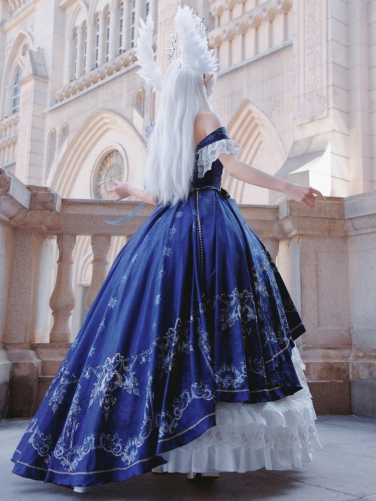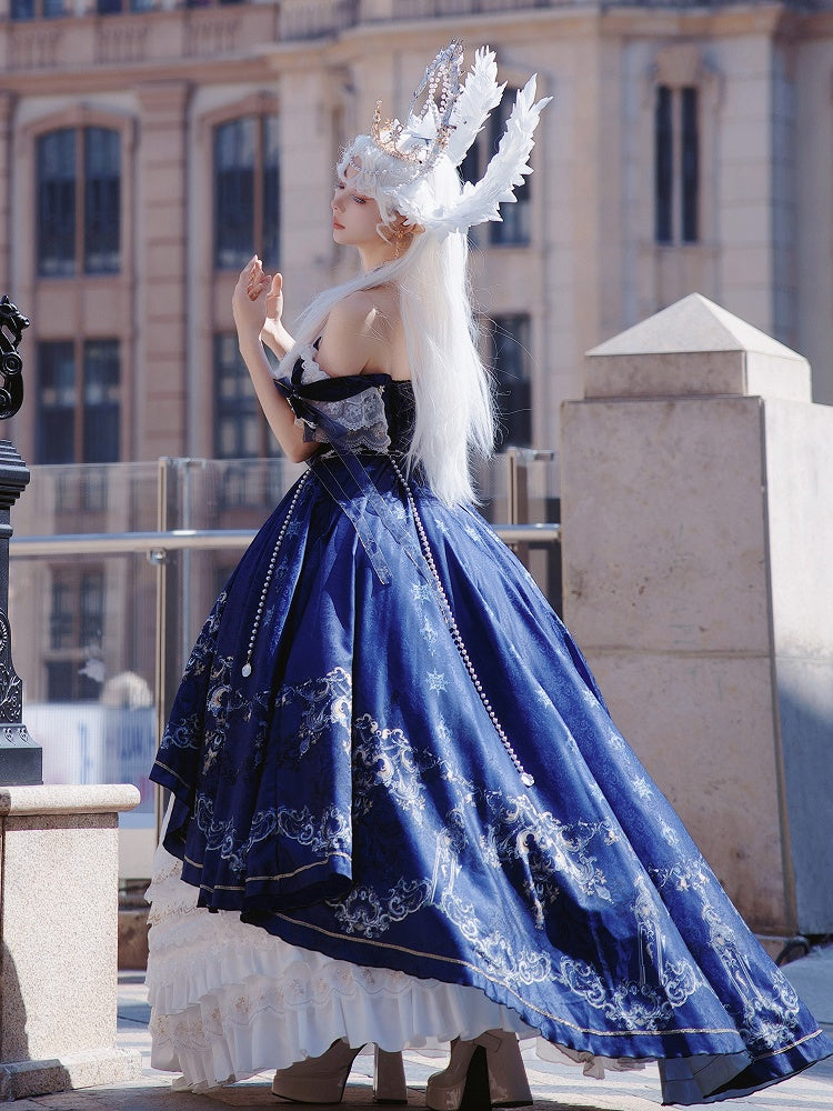 ダークブルーとホワイトのゴージャスなトレインドレスロリータジャンパースカート