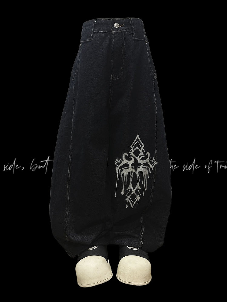 ダークブルーのクロスプリント ルーズワイドレッグジーンズ