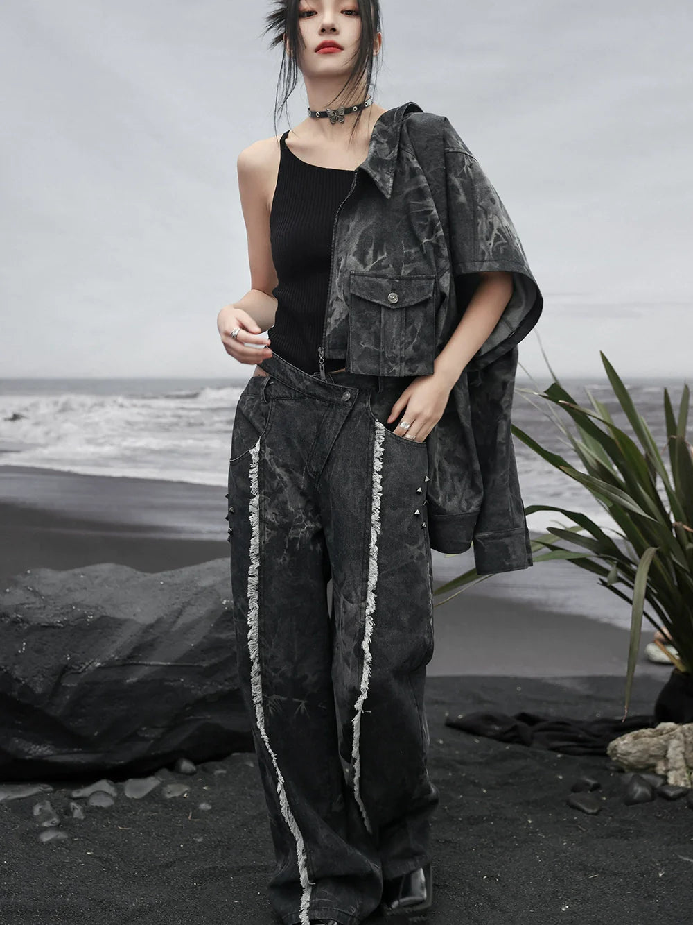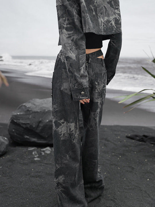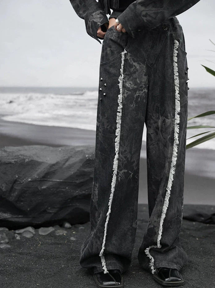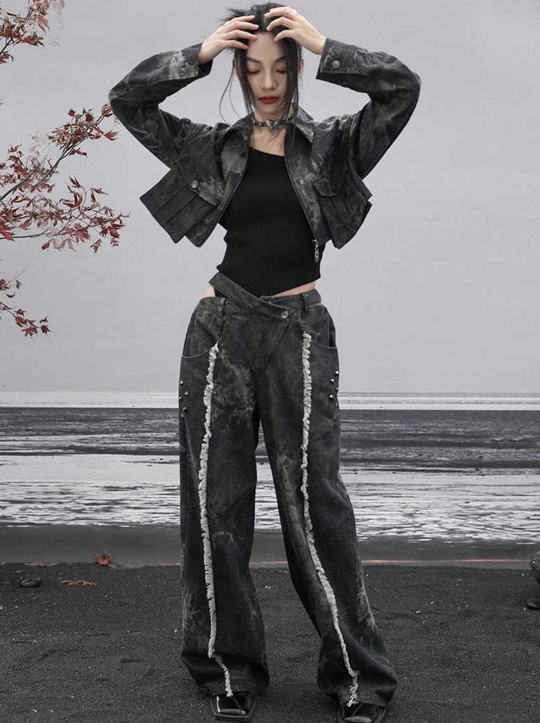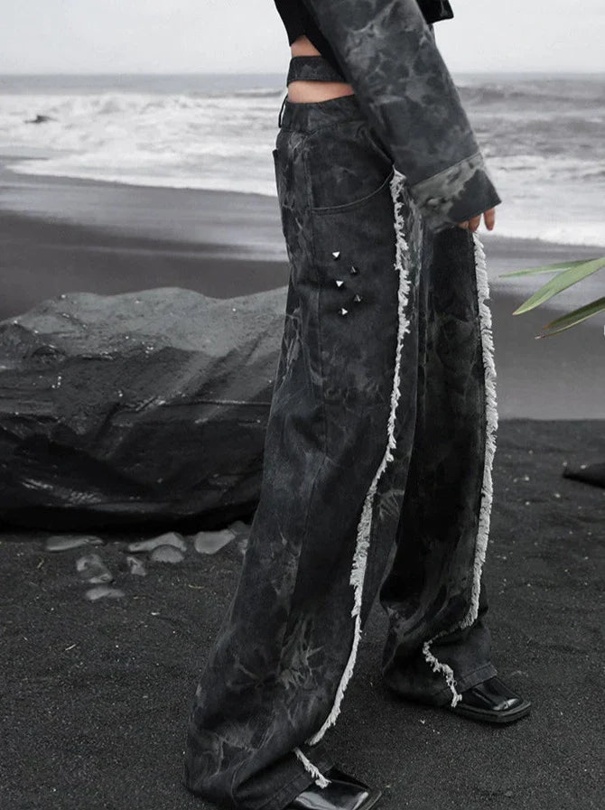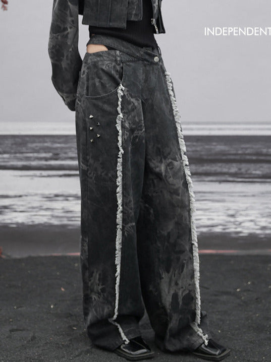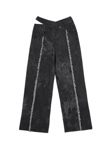 ダークデザインデニム ルーズフリンジ ワイドカットアウトウエスト