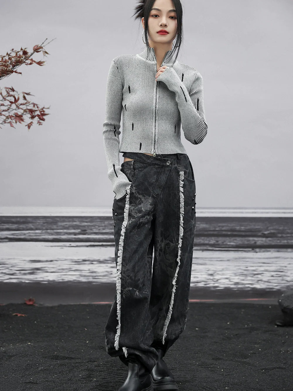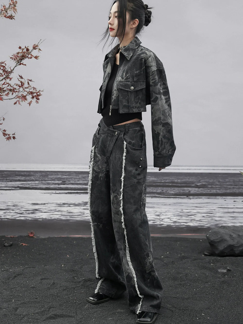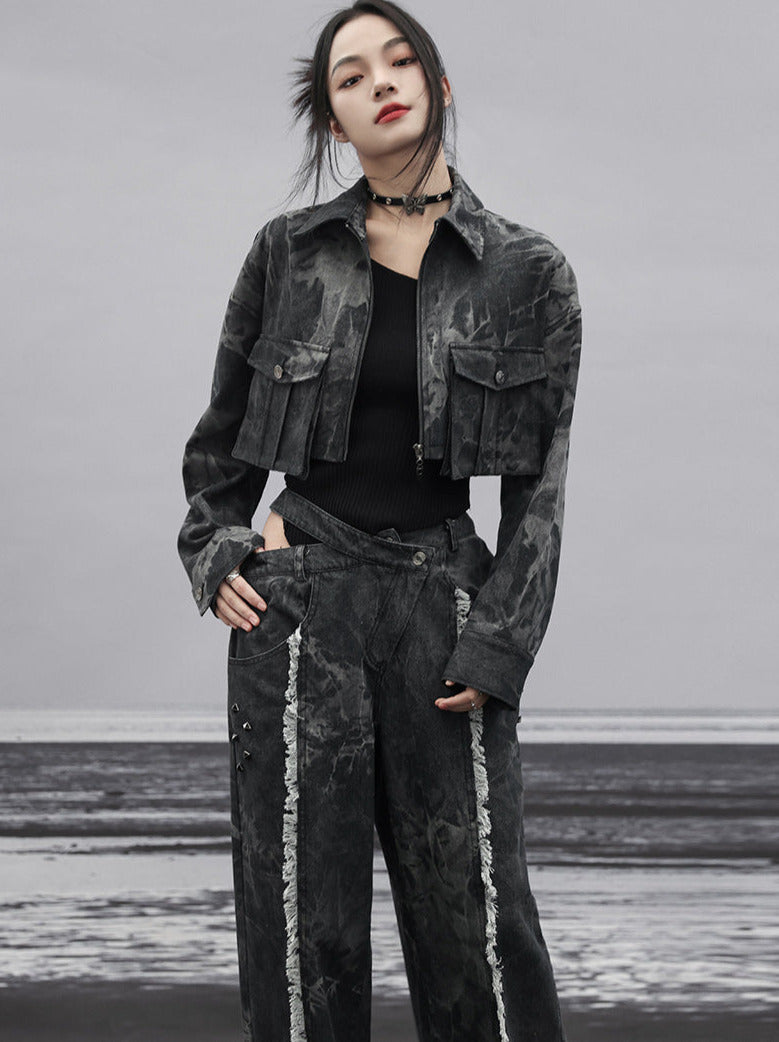 ダークデザインデニム ルーズフリンジ ワイドカットアウトウエスト