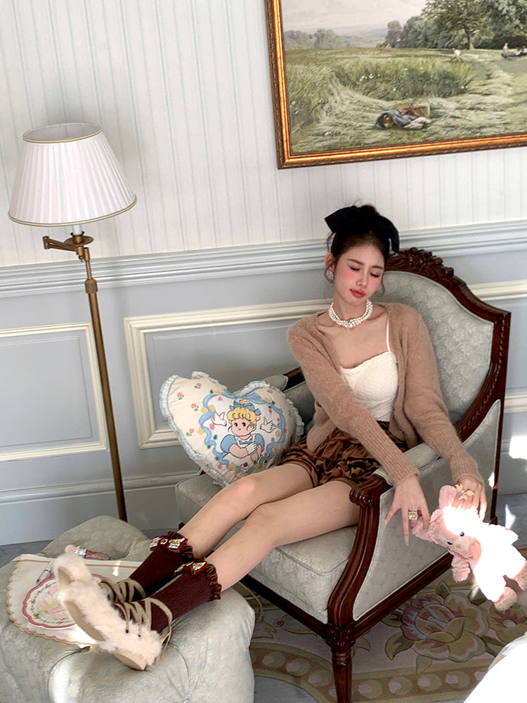 Dark Brown Plush Calf Socks with Rhinestone Bowknot Decoration