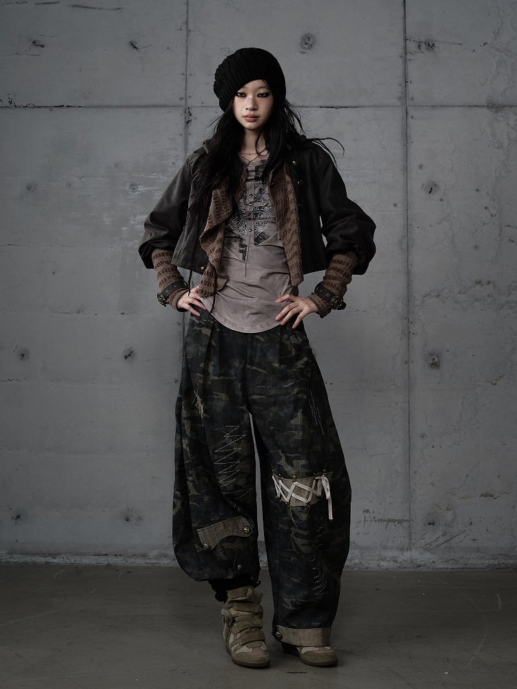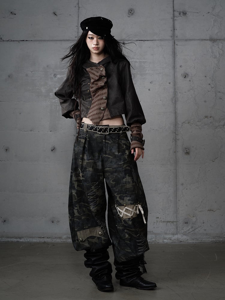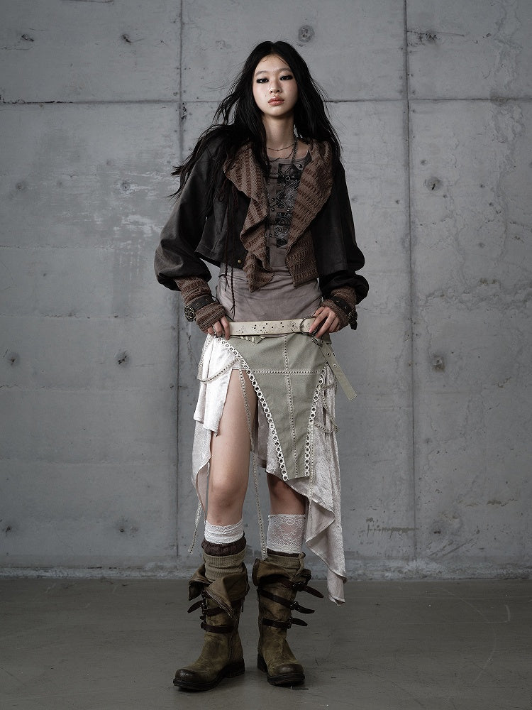 Dark Vintage Knit Jacket Hoodie with Green Paneling Suede