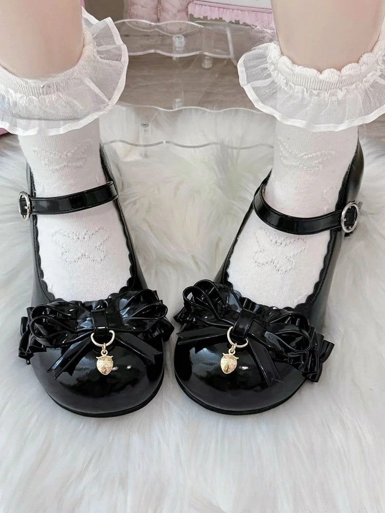 Strawberry Decor Bow, Ruffle Accents & Scalloped Design PU Black Mid-heel Mary Janes in PU Leather