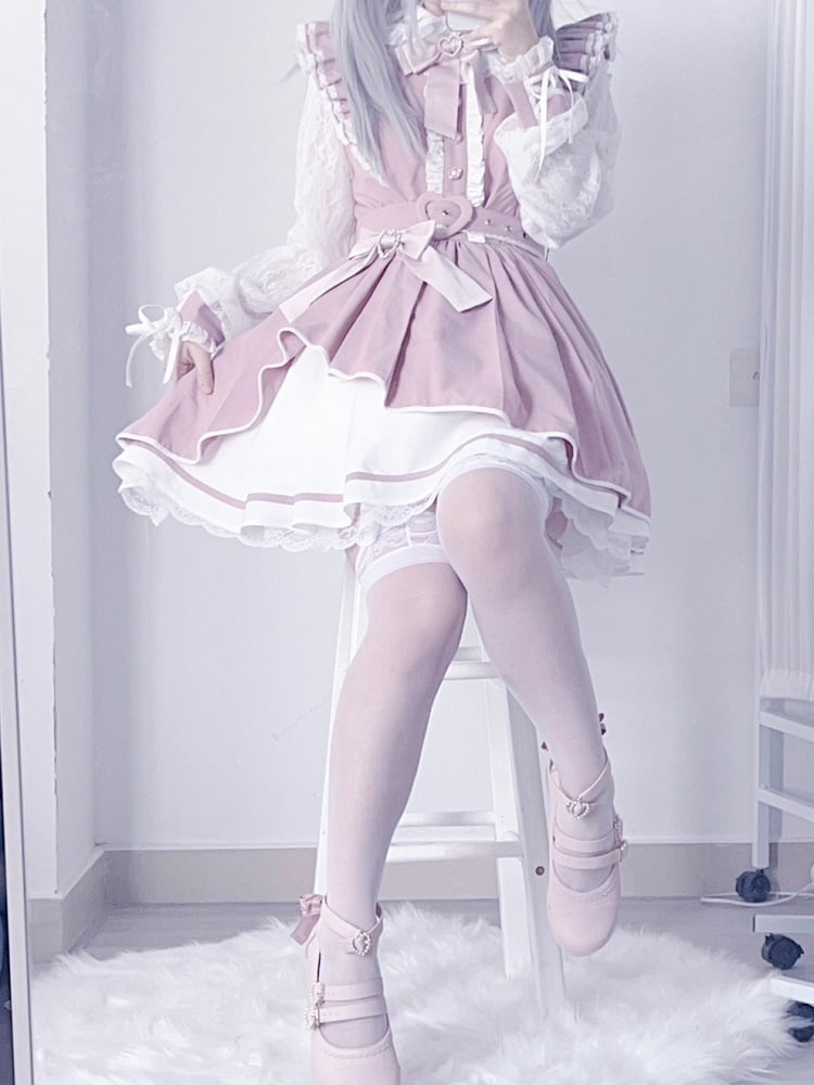 ピンクと白のオールドスクールロリータファッションドレス、蝶結びディテール、ロリータJSKセット