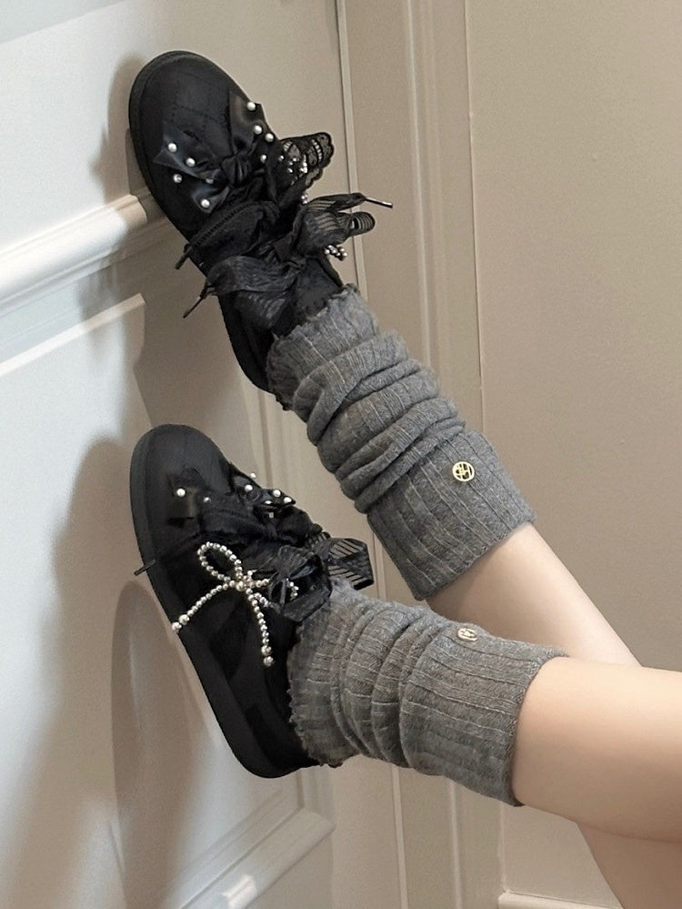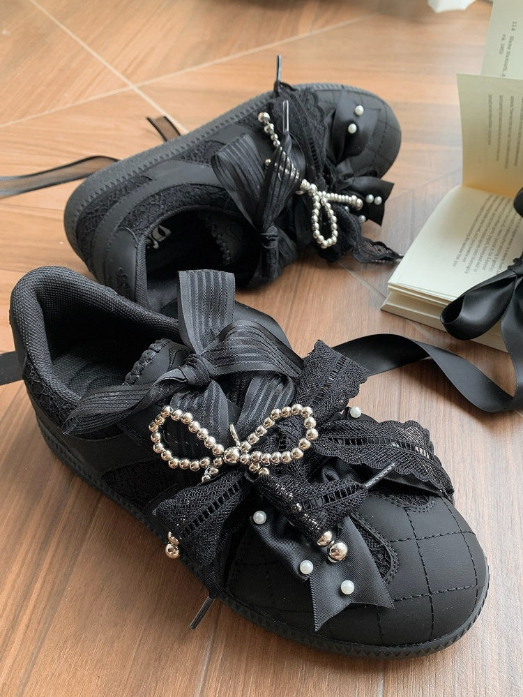 フロントビーズ装飾のブラックリボンレースアップレーストップタイスニーカー