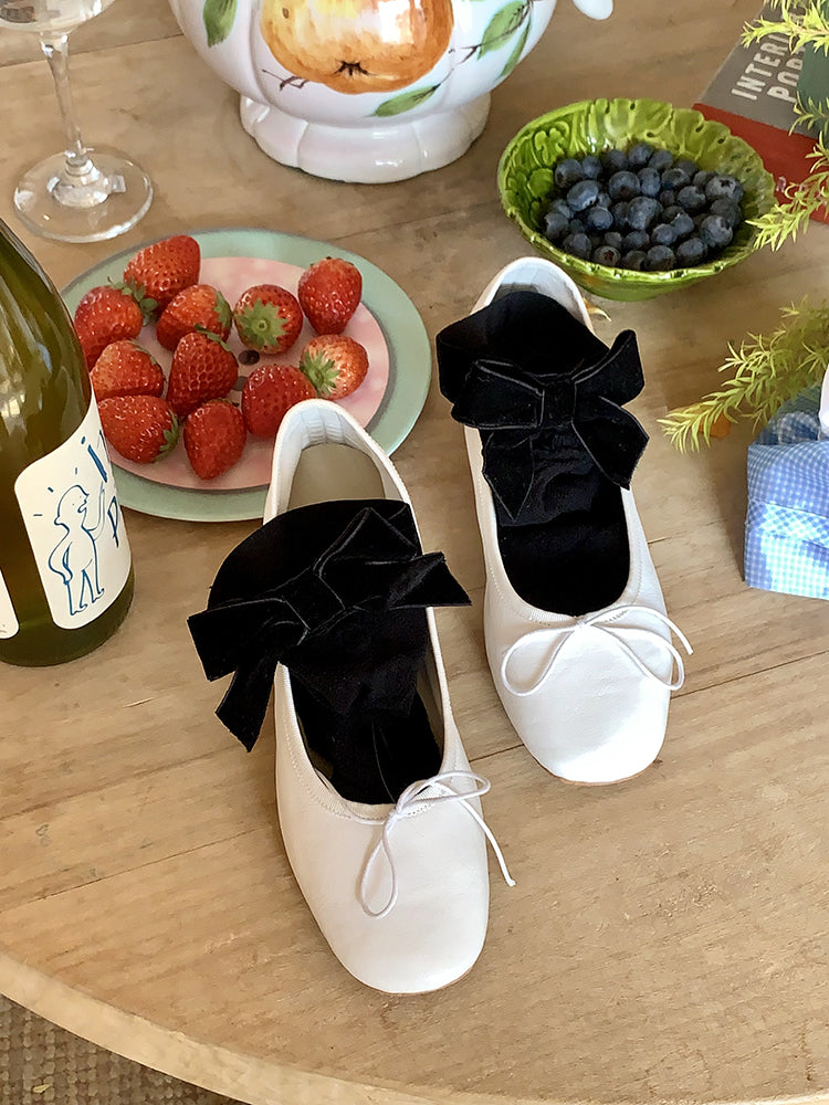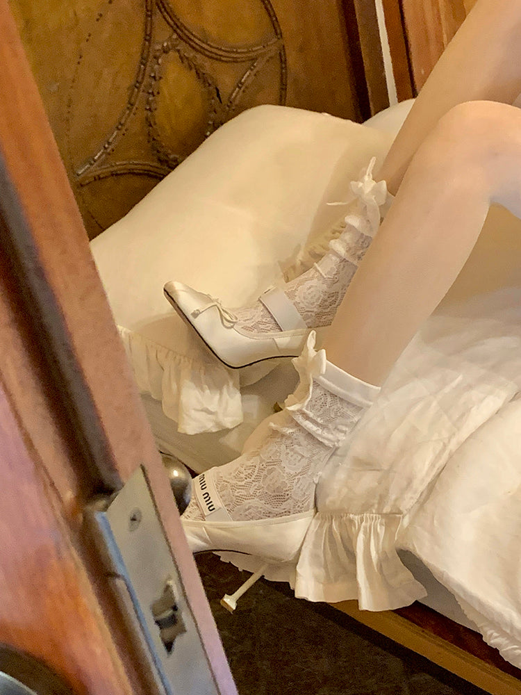 Black/White Lace Calf Socks with Velvet Bowknot Decoration