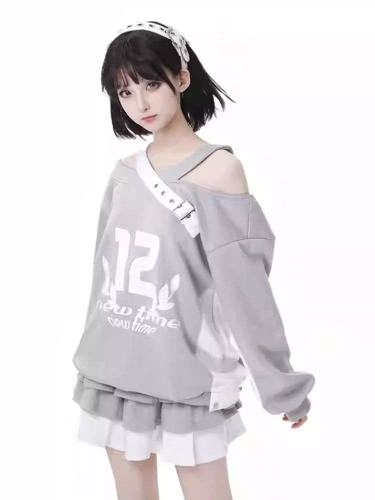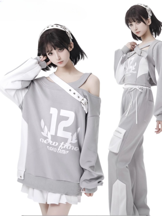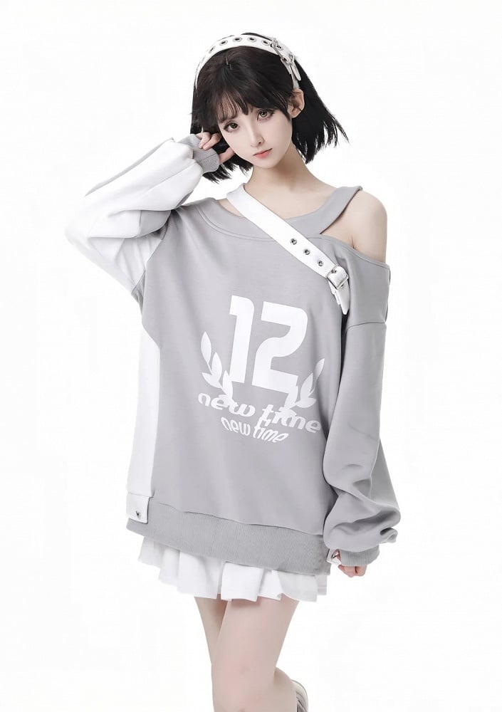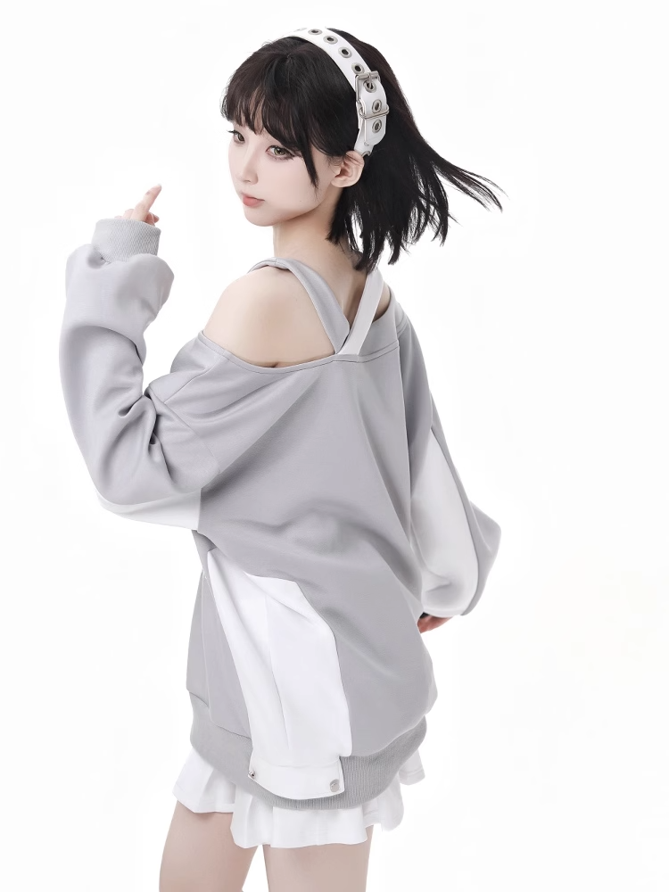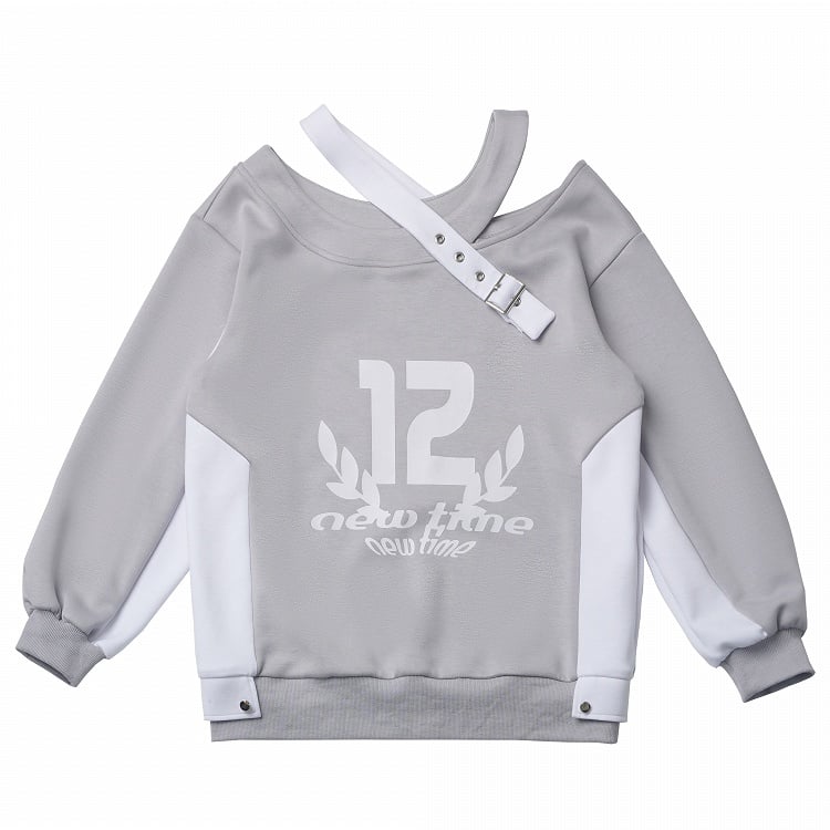 デザインカラーブロック グレー ホワイト アシンメトリーネックライン カットアウトショルダー スプリングスウェットシャツ