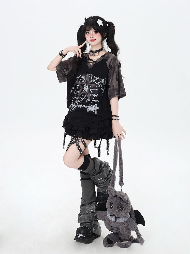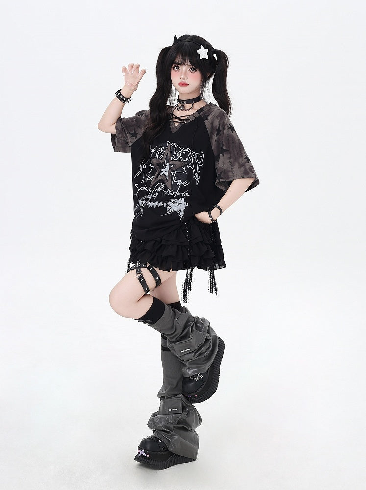ブラックカラーブロックデザイン レースアップ Vネック スタープリント ルーズTシャツ