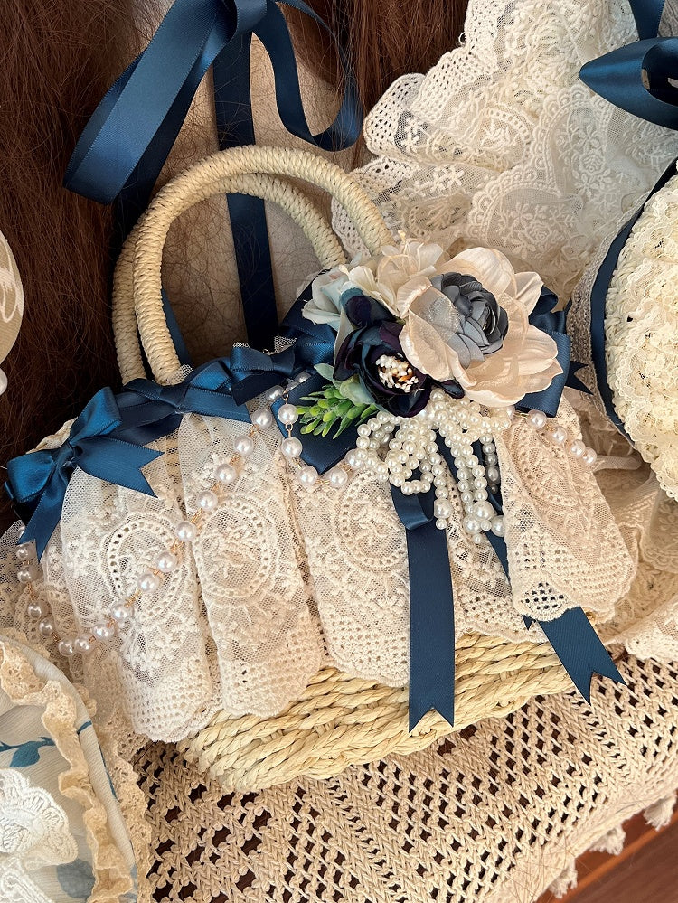 ブルーの花柄とビーズチェーンの飾りストロートートバッグ