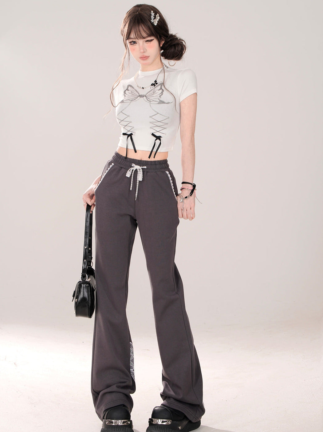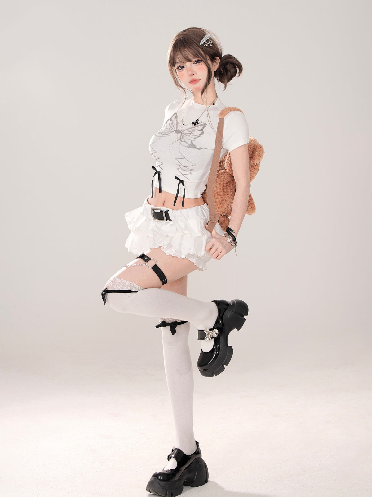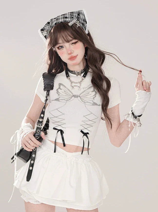ショート丈のスリムフィットと繊細なリボンデザインが特徴のキュートなデザインTシャツ。どんな装いにも華やかさを添えてくれます。