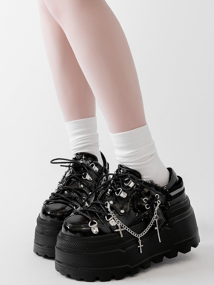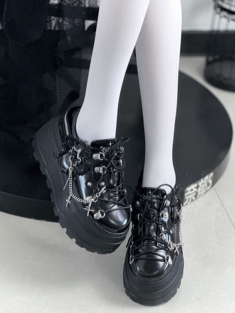 ブラックパンクフロントレースアップタイデザインプラットフォームシューズ、取り外し可能なクロスチャームチェーン付き