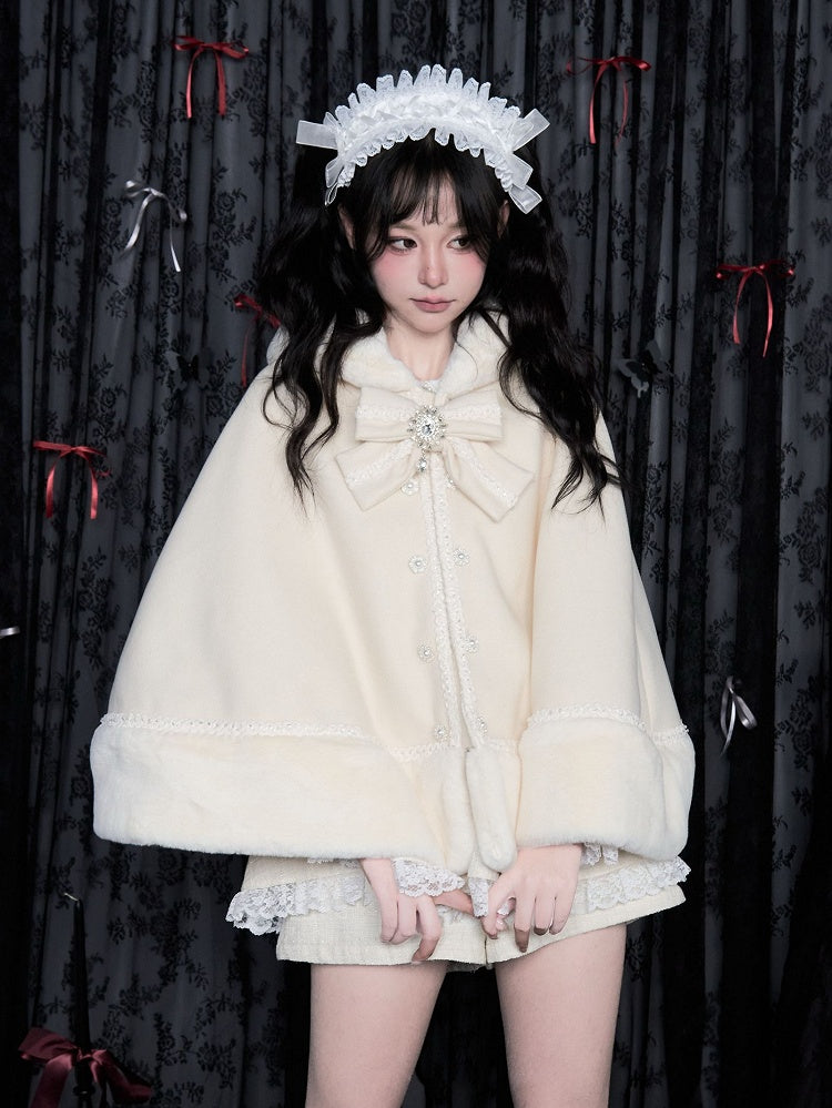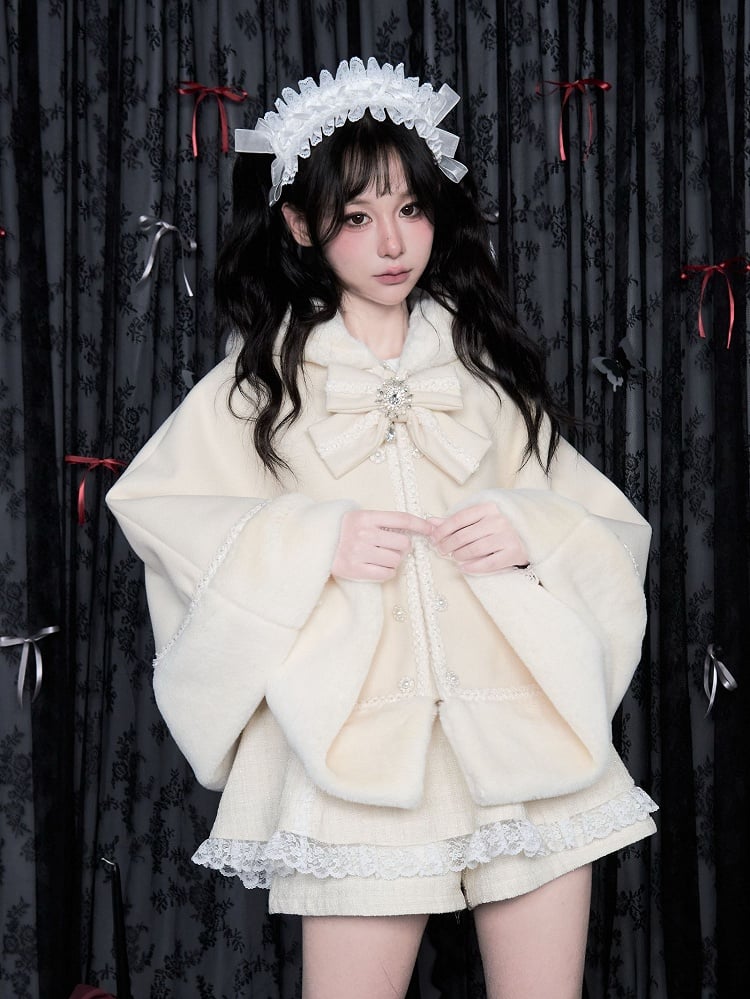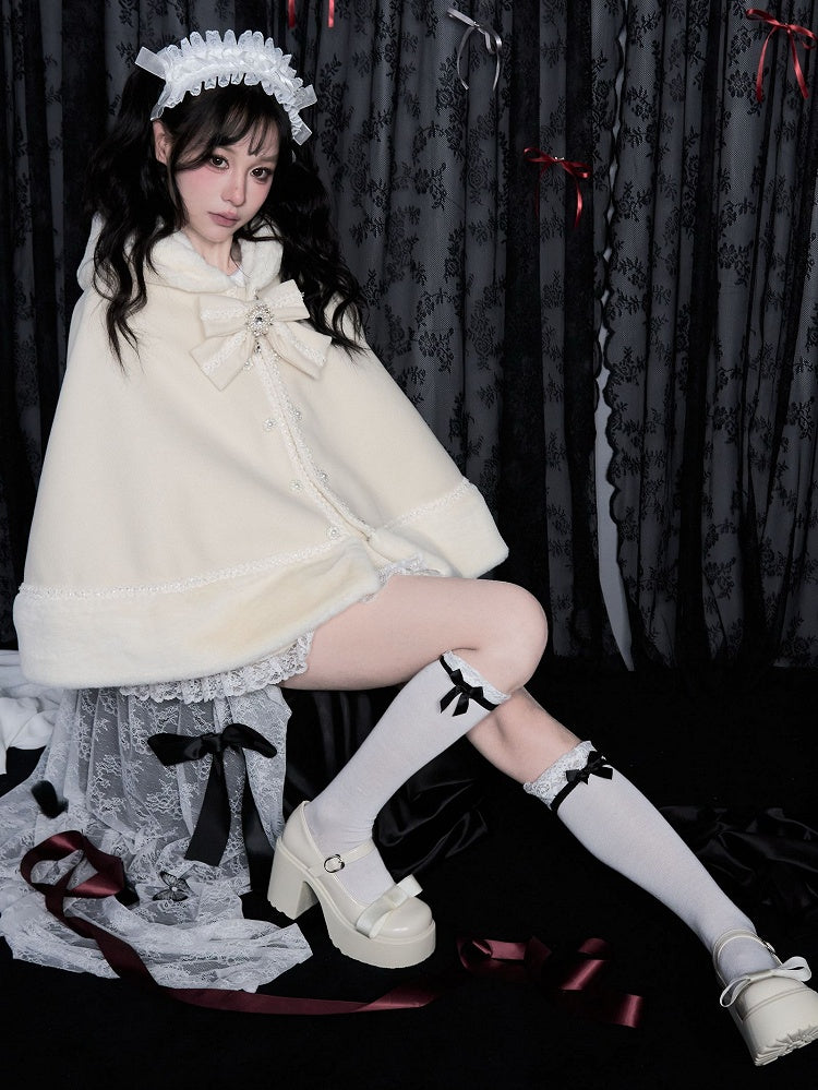 ジライケイ ぬいぐるみトリムミルクホワイトフード付きケープ(取り外し可能な大きなリボン付き)