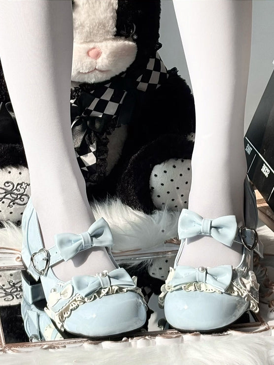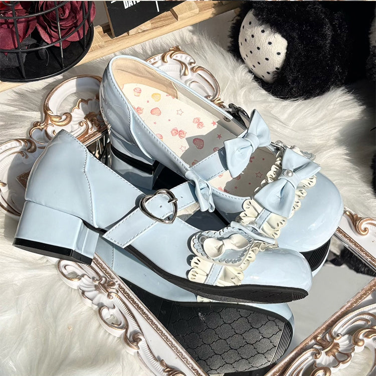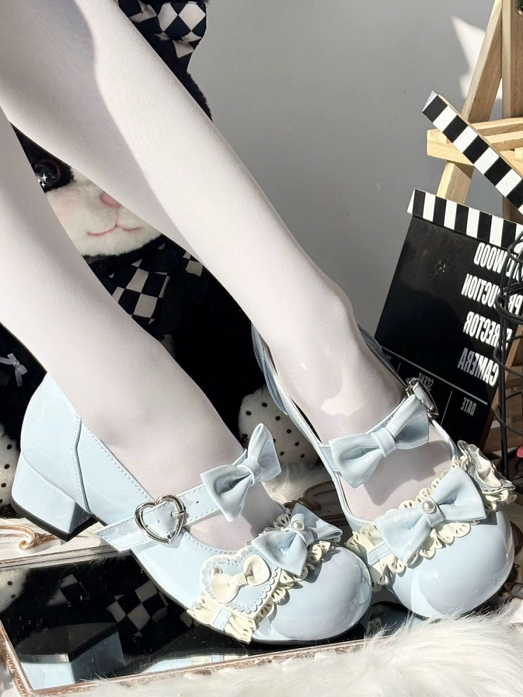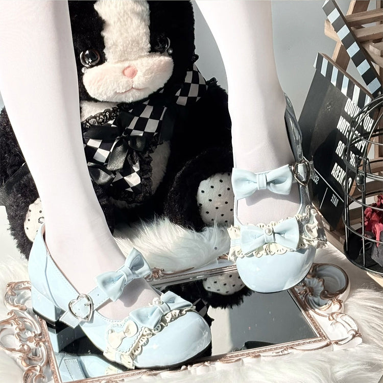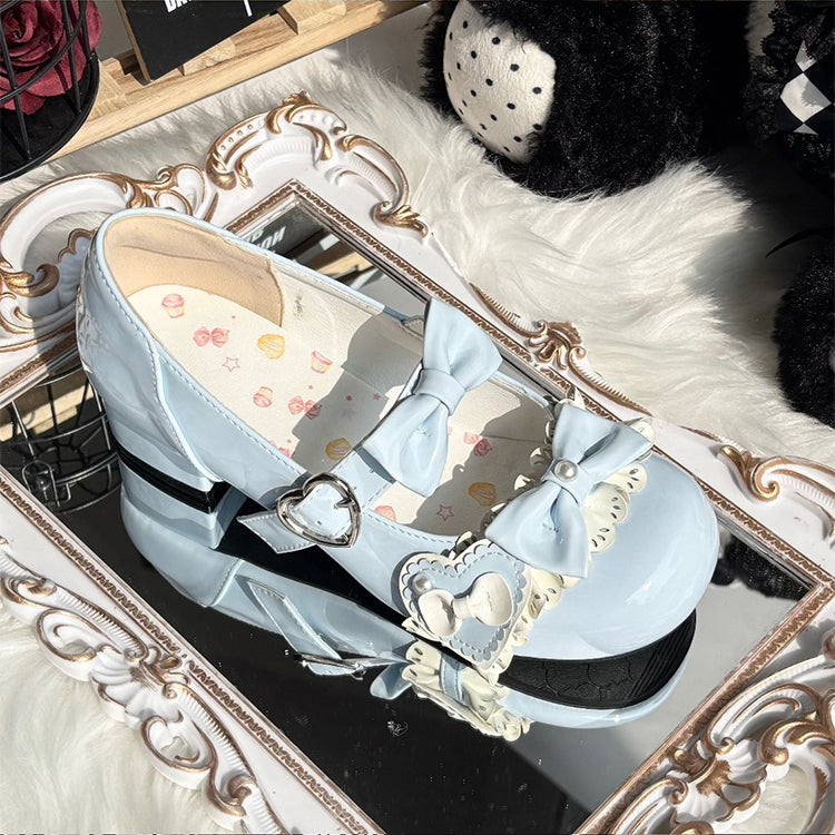 Beads Details, Heart Decor & Bow Embellishments Sweet Lolita Blue Low-heel Mary Janes
