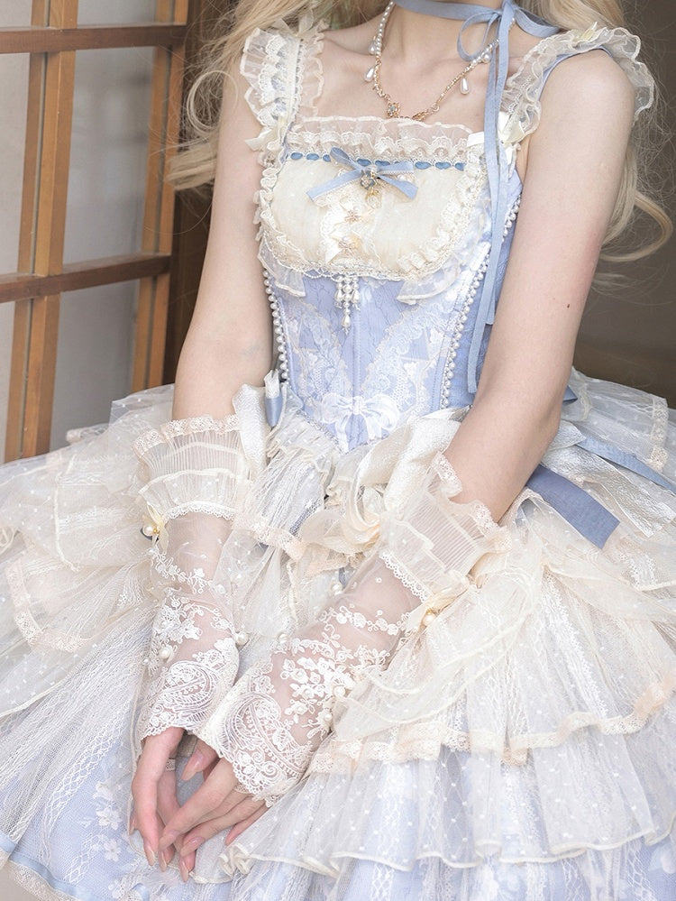 青と白のオールドスクールロリータファッションドレス 蝶結びディテール JSK セット