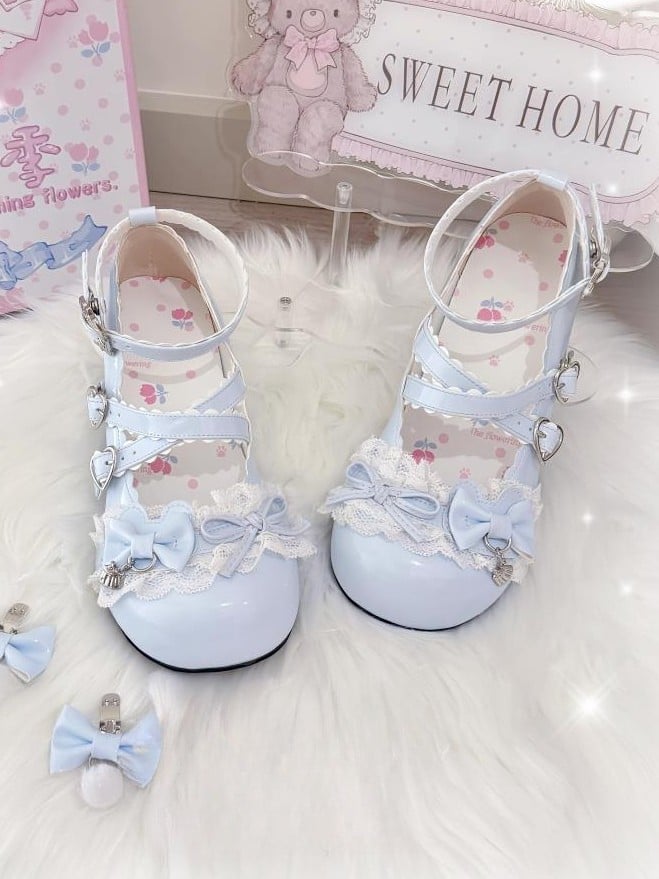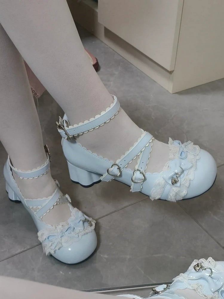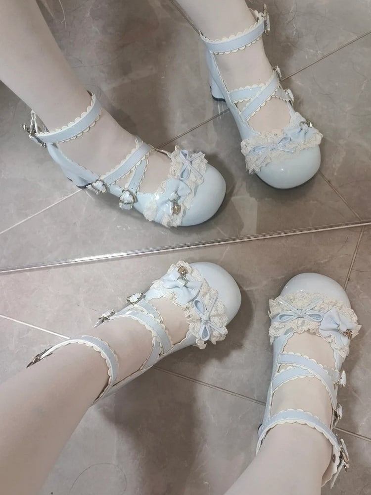 Bow Details, Cake Ankle Closure & Scalloped Edge PU Blue Mid-heel Mary Janes in Sweet Lolita