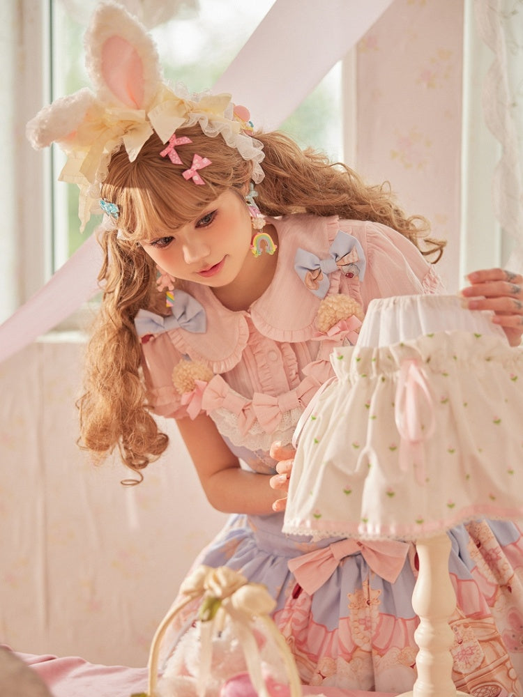 ピンクと白のオールドスクールロリータファッションドレス、蝶結びディテール、ロリータJSKセット