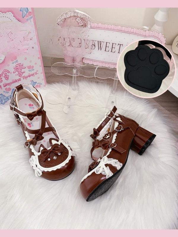 Kitten Details, Bow Details & Heart Buckle Brown PU Mid-heel Mary Janes in Sweet Lolita