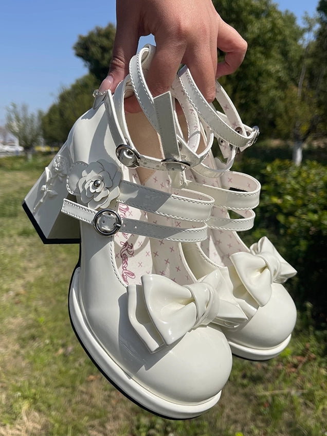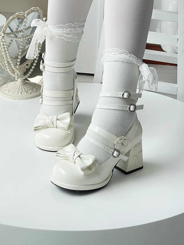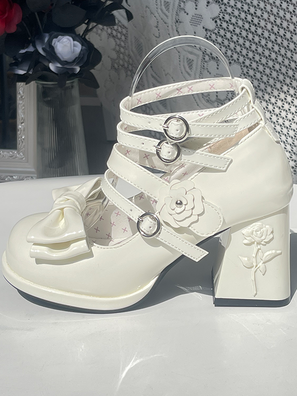 Rose Details, Top Bow & High-heel Design White Classic Lolita Mary Janes
