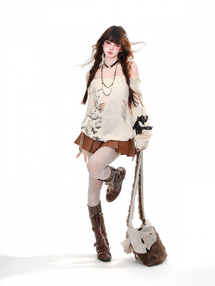 アプリコットのオフショルダーネックライン、バタフライ、ダメージ加工の穴あきニットトップス