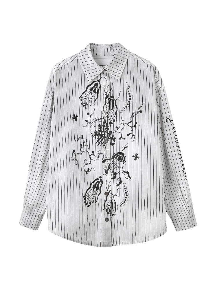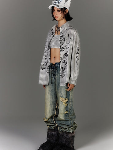オーバーサイズシルエットのブラック&ホワイトストライプ、ダメージ加工のグラフィティシャツ