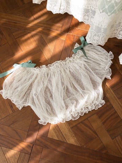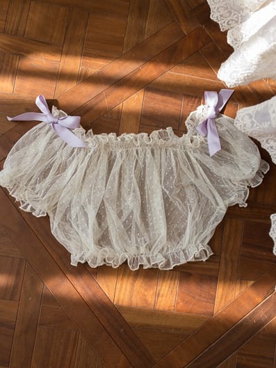 ドットチュールネックライン クリーミー伸縮性ブラウス