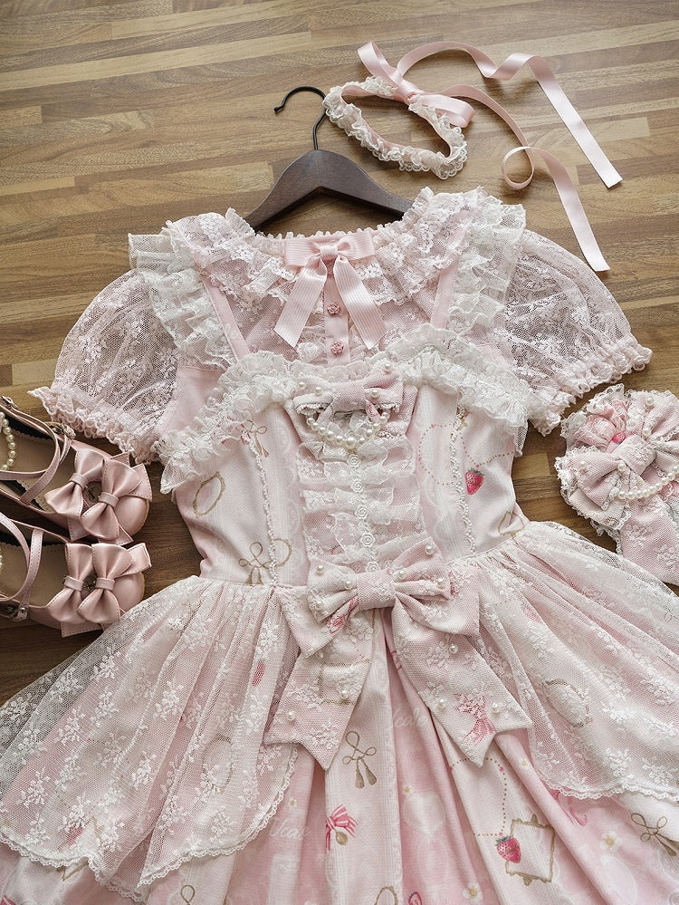 ピンクと白のオールドスクールロリータファッションドレス、蝶結びディテール、ロリータJSKセット