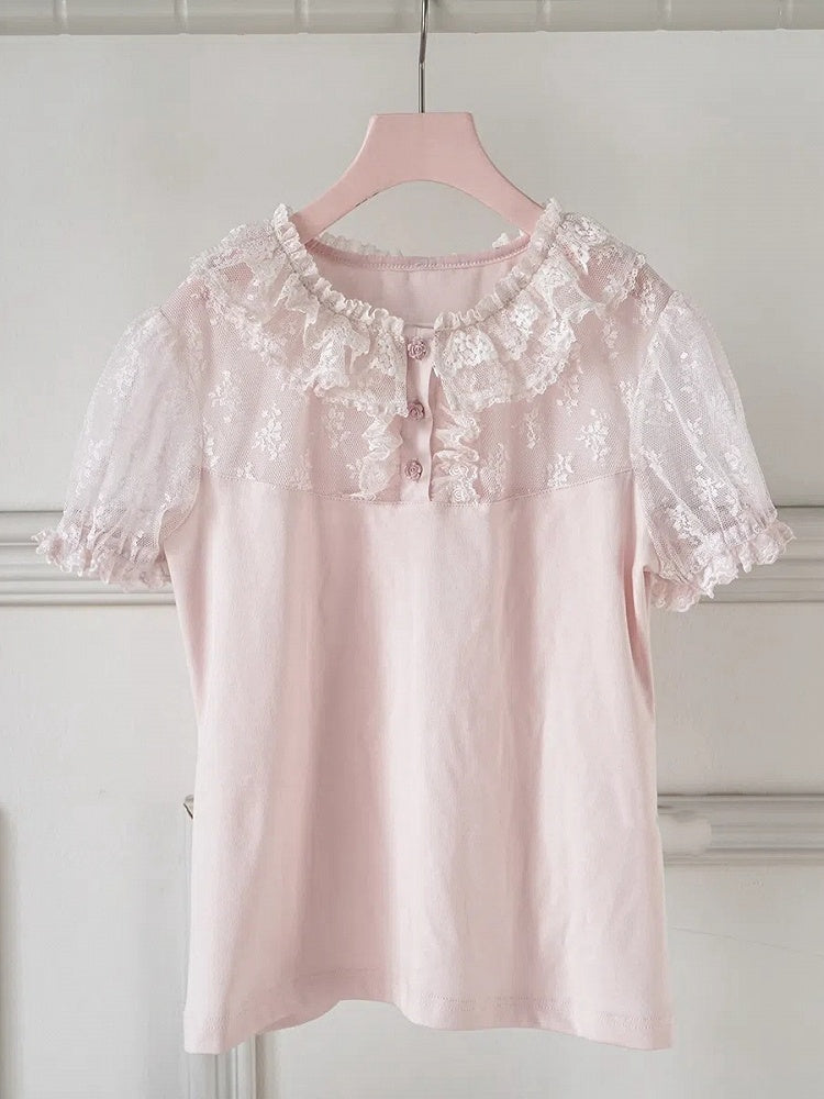 ピンクの二重層チュールカラー半袖ロリータブラウス