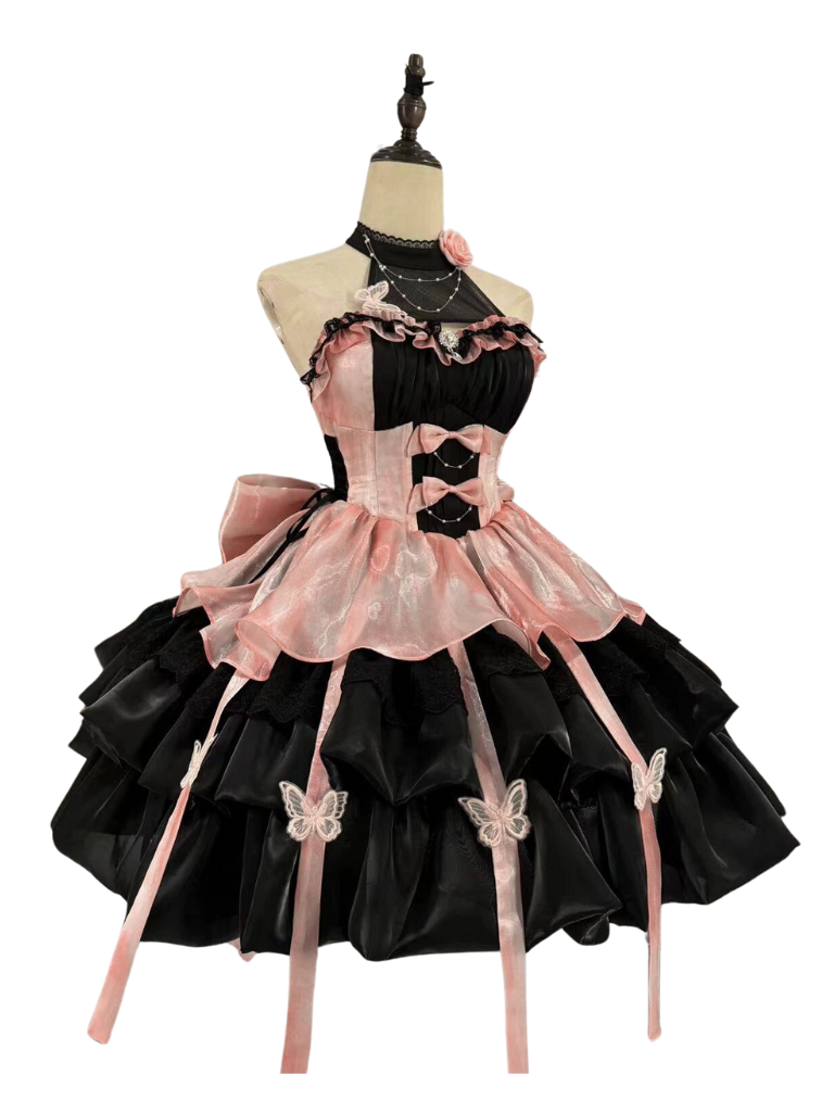 ドレス ブラック サスペンダー ホルター ロリータ ネック プリンセス ピュア ピンク スタイル
