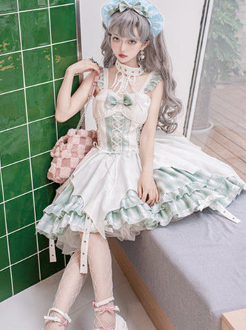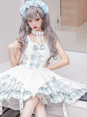 青と白のオールドスクールロリータファッションドレス 蝶結びディテール JSK セット