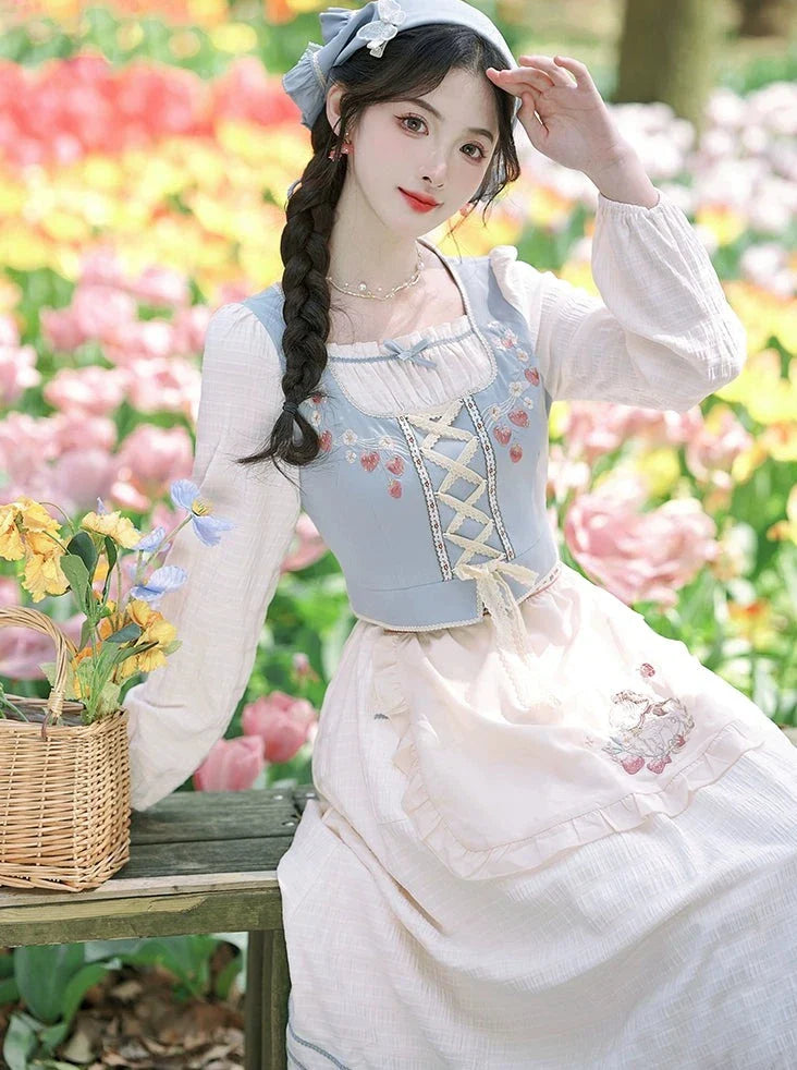 青と白のオールドスクールロリータファッションドレス 蝶結びディテール JSK セット