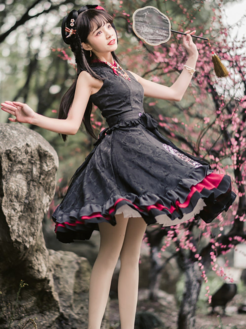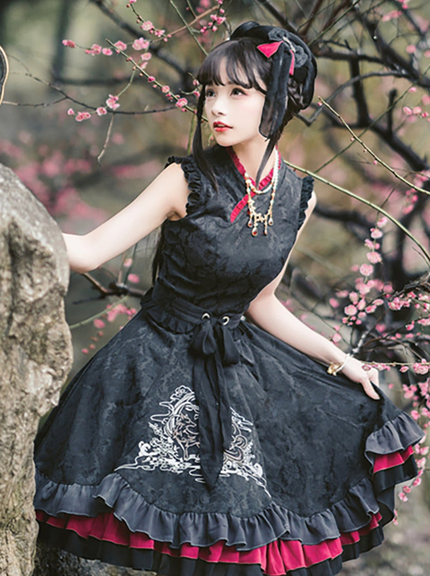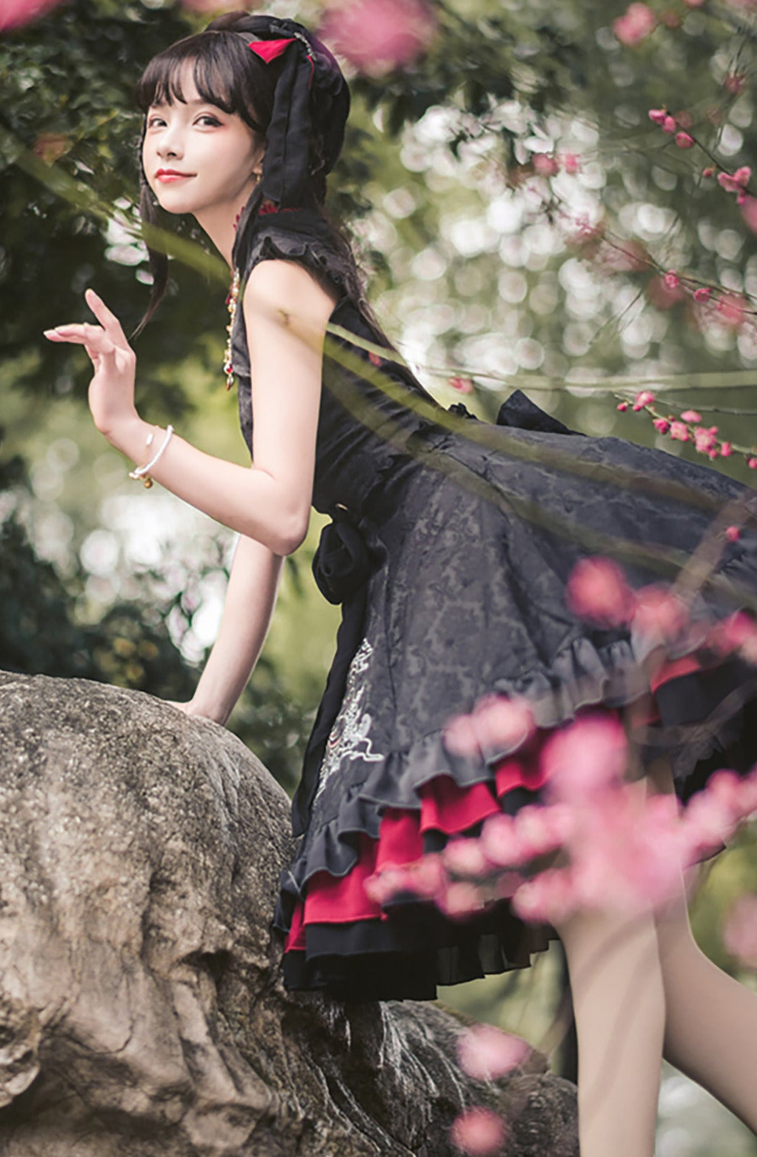 黒と白のオールドスクールロリータファッションドレス蝶結びロリータJSKセット