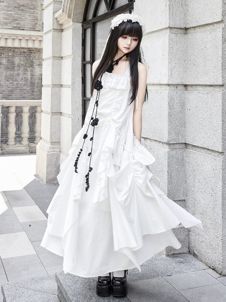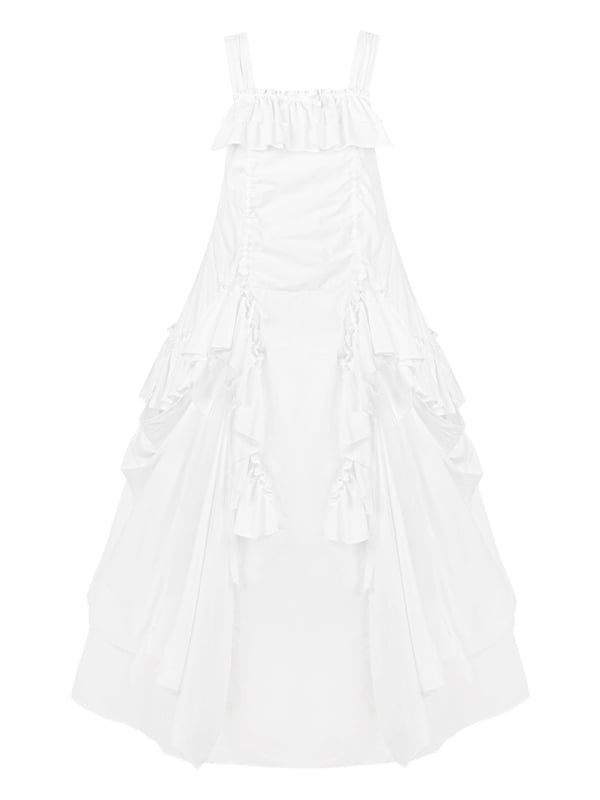 ホワイトゴスドローストリングデザインカスケーディングフリルルーズドレス