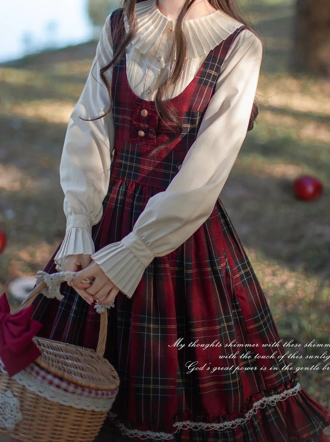 リボンカラーが可愛らしいワンピースは、コーディネートにキュートなアクセントを添えてくれます。フード付きのヘッドドレスとレッドのライディングカラーは、スタイリッシュで実用的。ティアードプリーツケープとチェックシャツが、より一層の可愛らしさを演出します。スカーフ付きで、さらに暖かさをプラスできます。