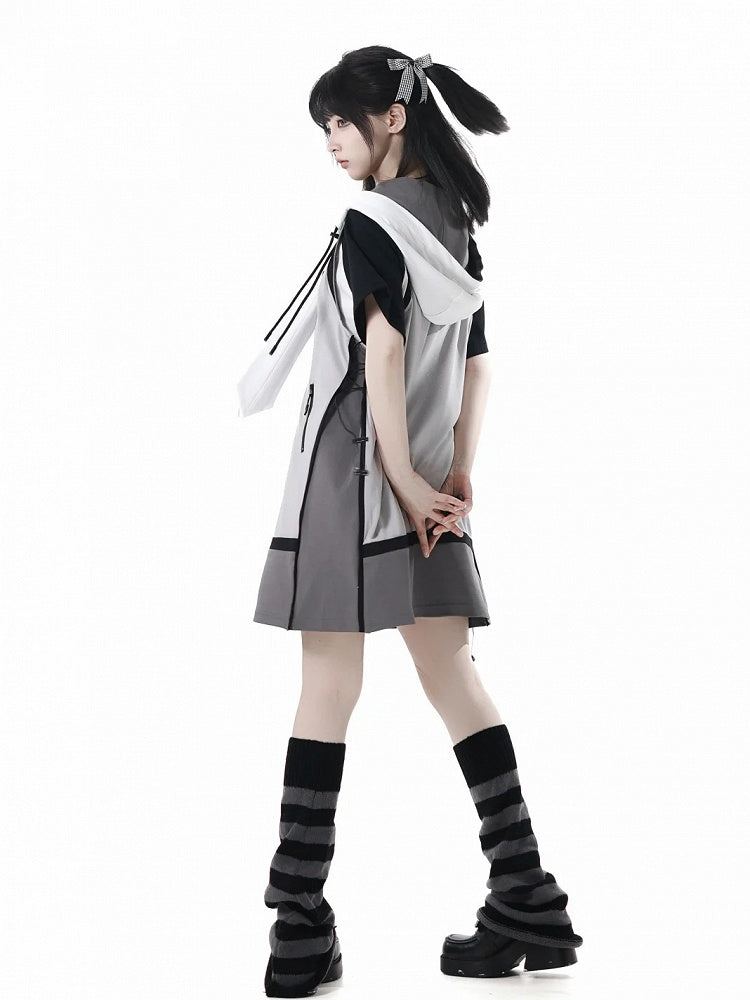 グレーのカラーブロックデザイン、ドローストリングサイドテックウェアフード付きベストドレス