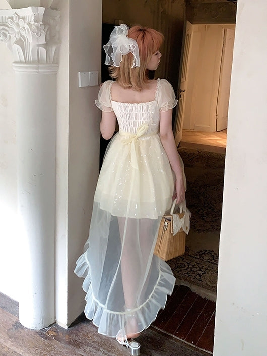 ● Bowknot Details / Patchwork Design / Ruffle Trim / Self-tie Straps / Sequins / Smocked Elastic at Back / Square Neckline and Short Puff Sleeves