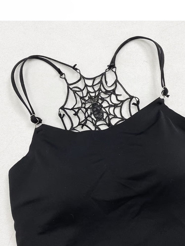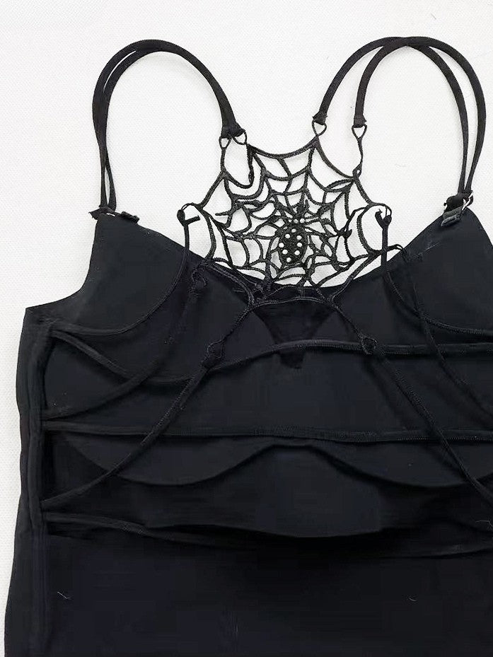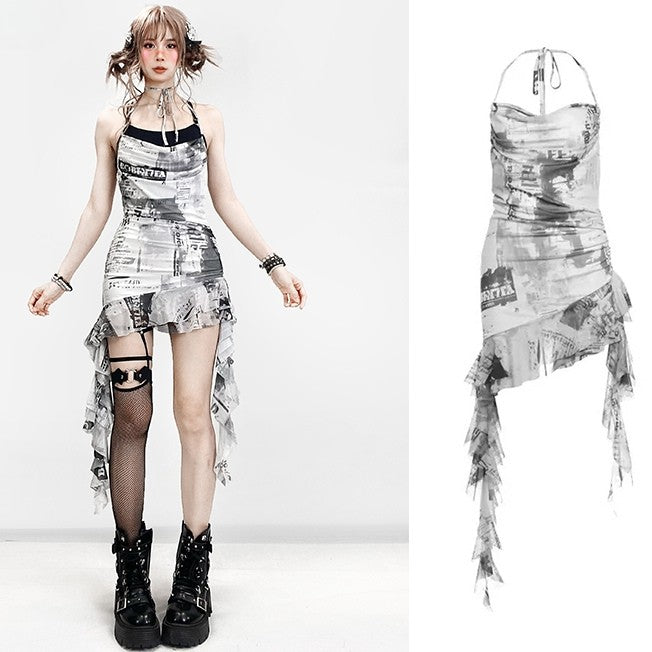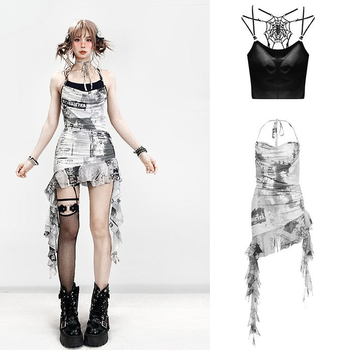 ダイタイデザイン + チェック柄キャミソールドレス トップネック アシンメトリースカートディテール ホワイト ブラックヘム ホルターネック スパイダーウェブ