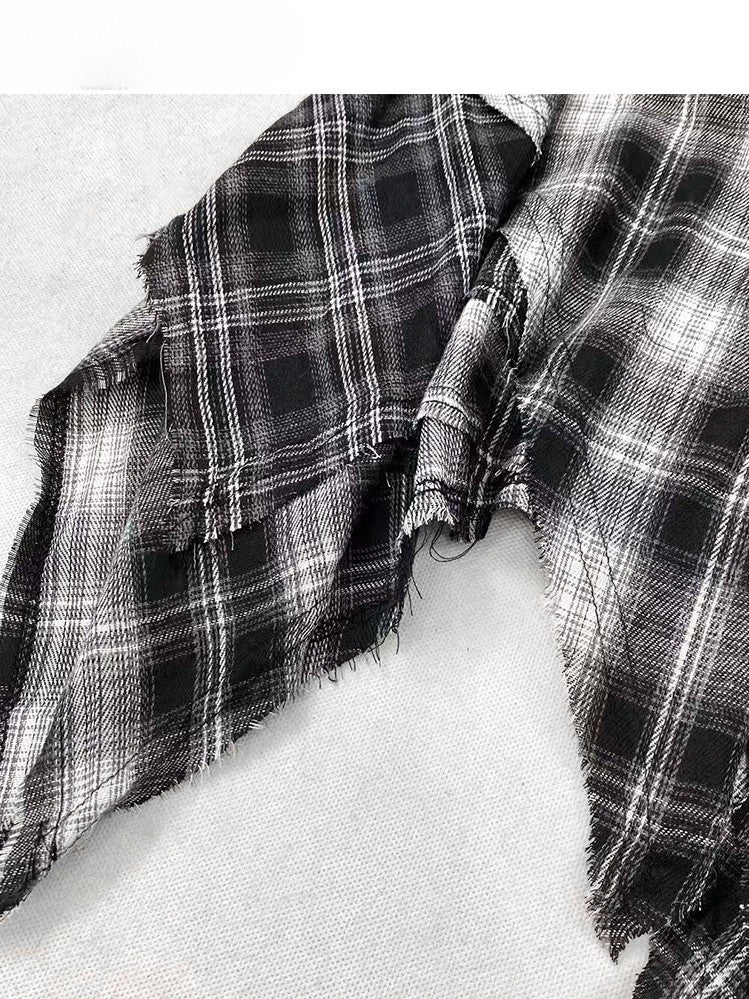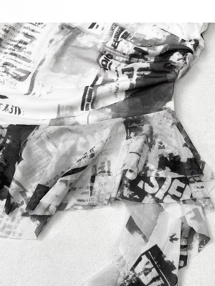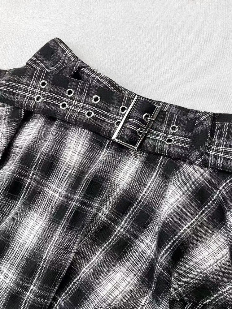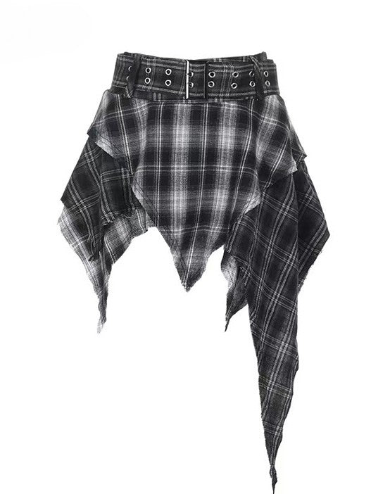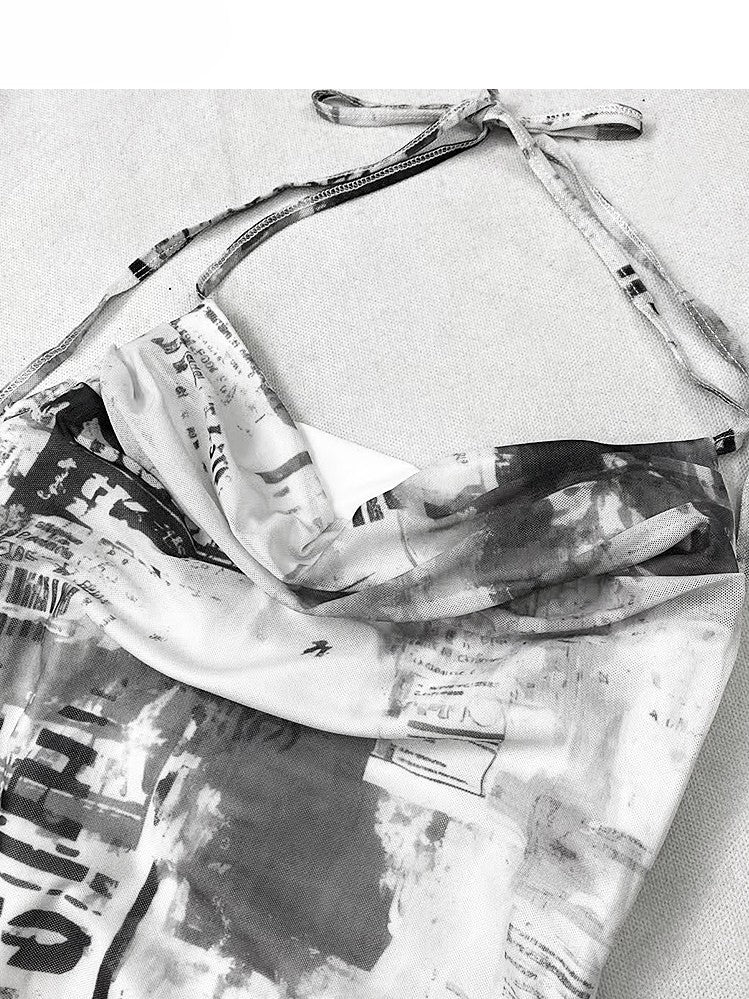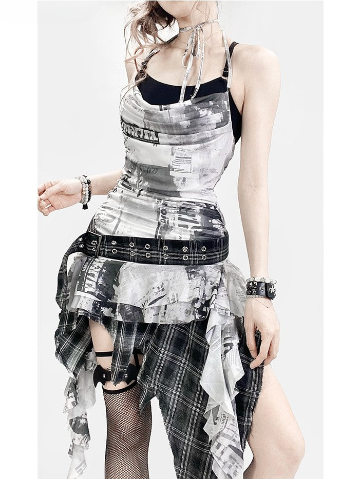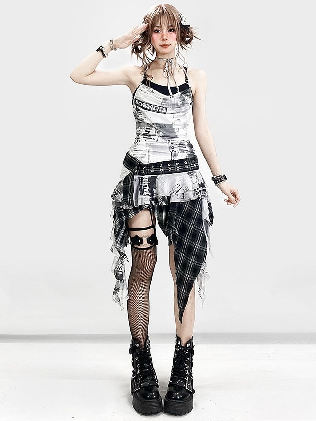 ホワイトのタイダイ柄ホルターネックドレス + ブラックのスパイダーウェブディテールキャミソールトップス + チェック柄アシンメトリーヘムスカート