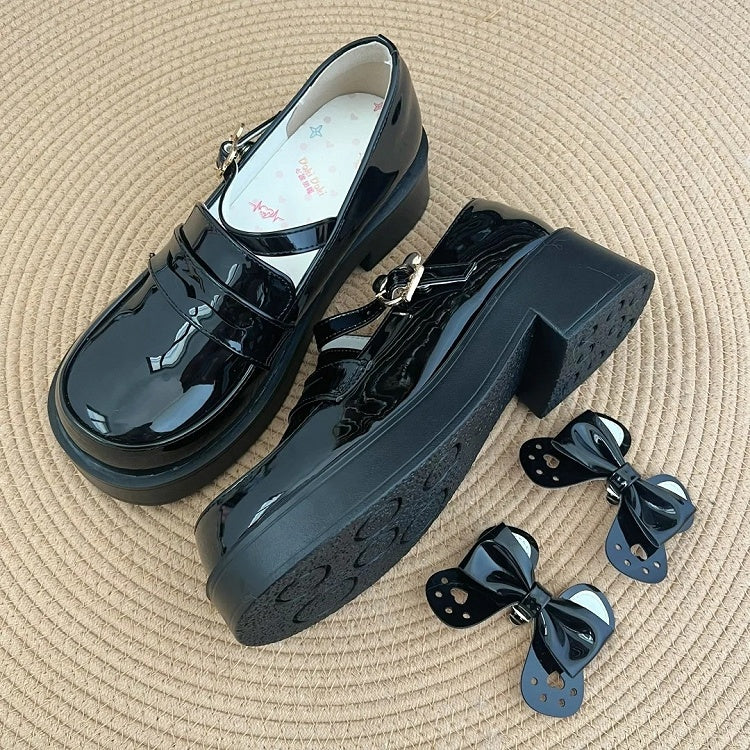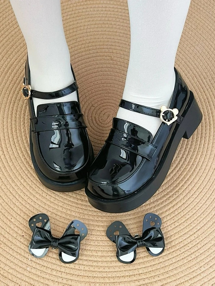 Ear Buckle - Shoes PU JK Heel Detachable Mid Black Bow Polished Academic with Style Bear