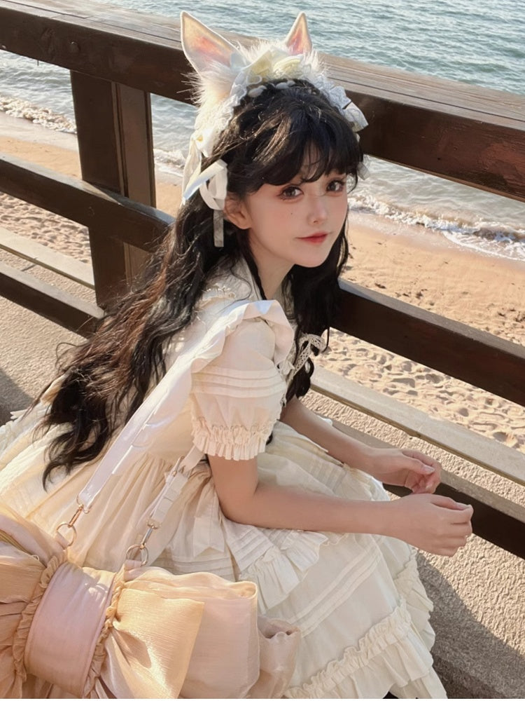 ホワイトの蝶結びディテール、ウサギの耳のレーストリムKC