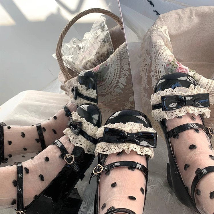 Sweet Style Black Mary Janes with Low Heel - Lace Edging, Bow Accents and Heart-Shaped Clasp