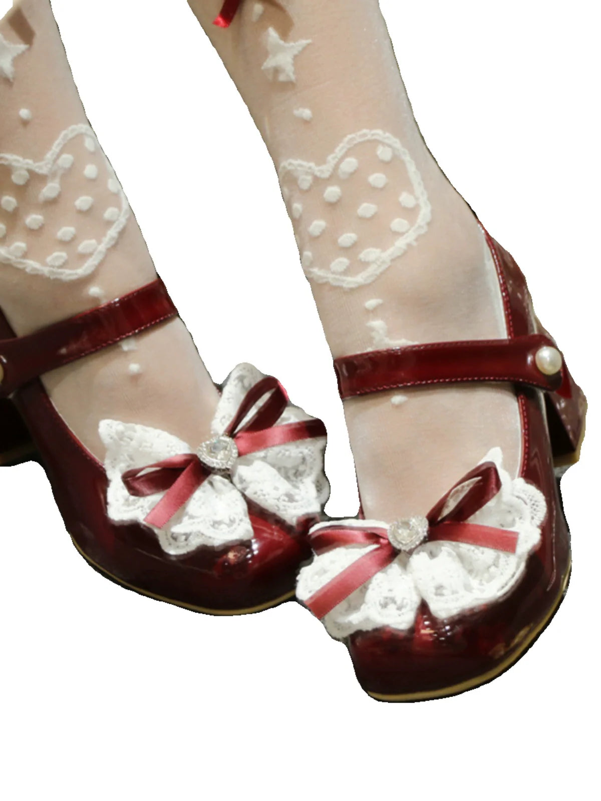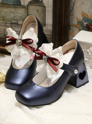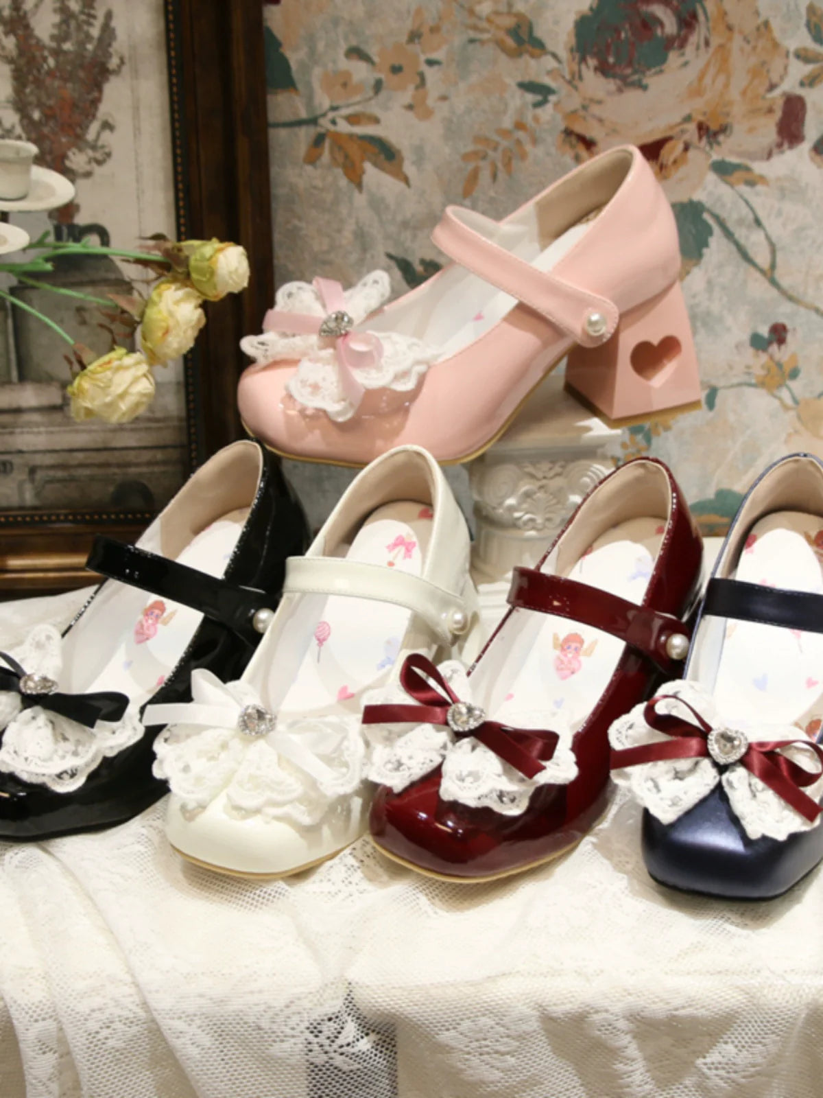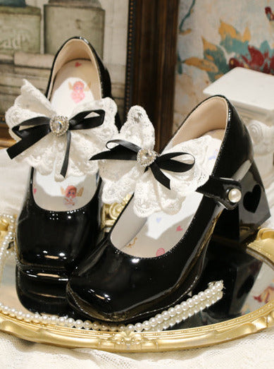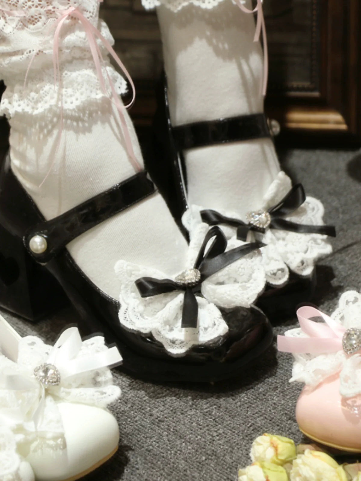 エレガントなフレンチスクエアレースリボンシューズヒールトゥロリータラブ